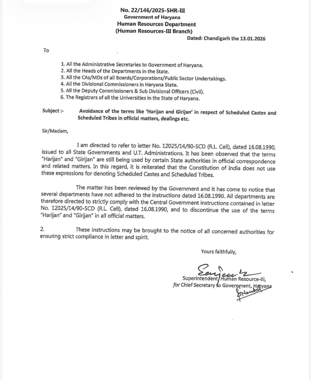चंडीगढ़: हरियाणा सरकार ने “हरिजन” या “गिरिजन” जैसे शब्दों के प्रयोग पर रोक लगाने के निर्देश जारी किए हैं।