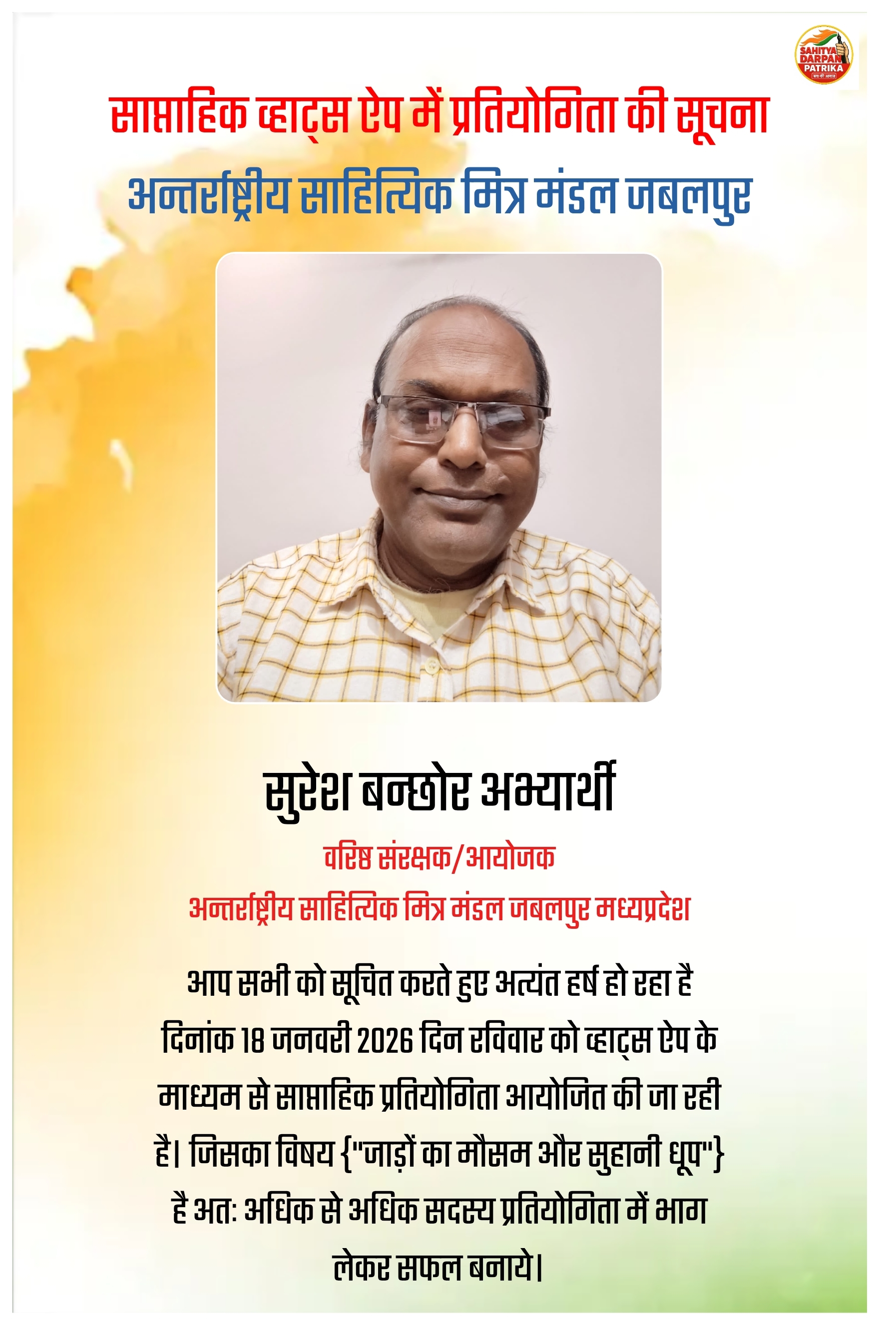 साहित्यिक मित्र मंडल जबलपुर में प्रतियोगिता का आयोजन होना निर्धारित किया गया है।