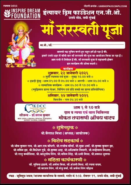 Inspire Dream Foundation एन.जी.ओ. (उलवे नोड, नवी मुंबई) की ओर से माँ सरस्वती पूजा का भव्य आयोजन श्रद्धा एवं उत्साह के साथ किया जा रहा है। यह कार्यक्रम शुक्रवार, 23 जनवरी 2026 से शनिवार, 24 जनवरी 2026 तक आयोजित होगा।
