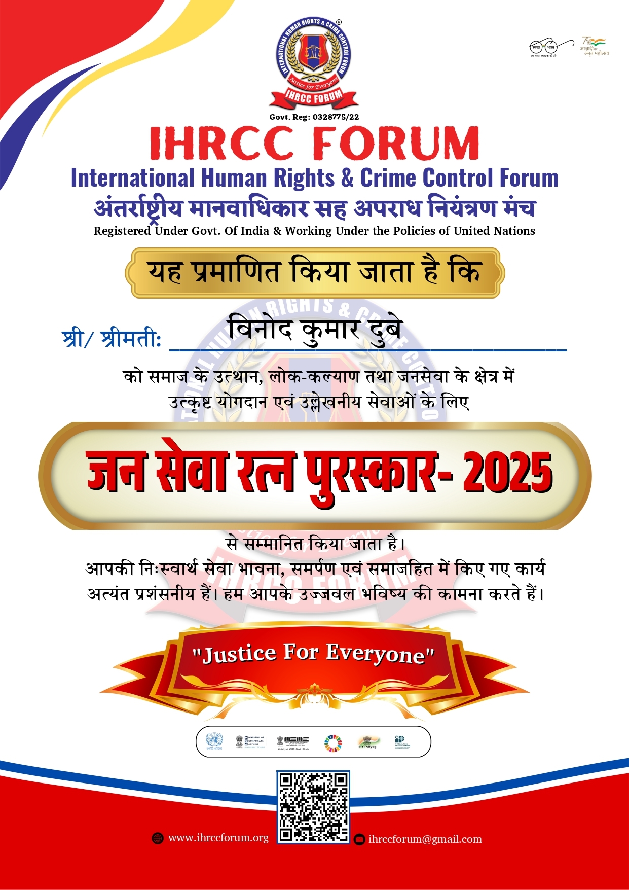 IHRCC FORUM ठाणे जिला अध्क्ष्य बिनोदकुमार दुबे जन सेवा रत्न पुरस्कार 2025