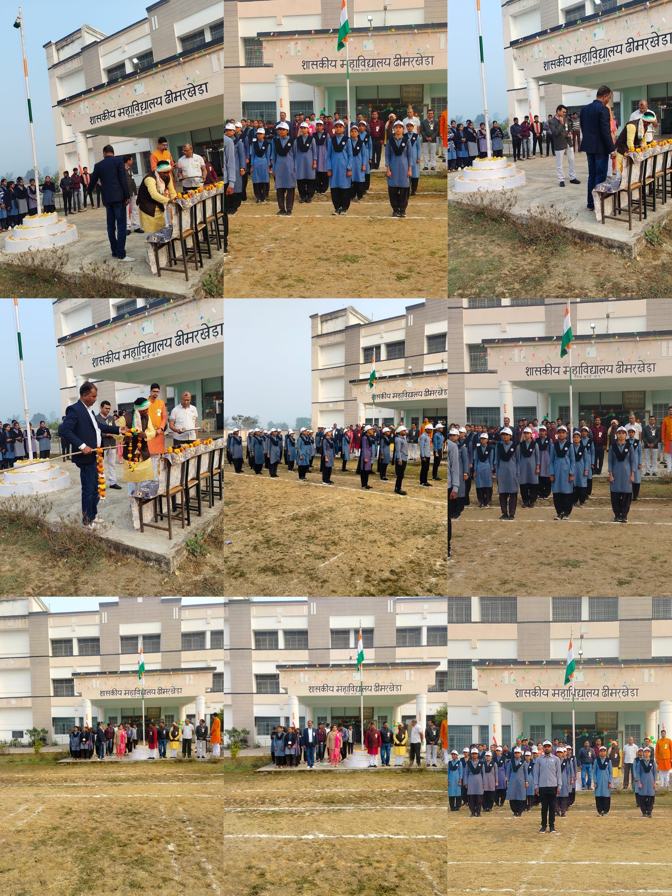 आज शासकीय महाविद्यालय ढीमरखेड़ा जिला कटनी मध्यप्रदेश में शासन एवं विभाग के निर्देशानुसार प्रभारी प्राचार्य डॉ बृजलाल अहिरवार के निर्देशन में महाविद्यालय के प्राचार्य ने पूजा अर्चन के बाद ध्वजारोहण किया तथा पूर्व प्रक्रिया के बाद एन एस एस कार्यक्रम अधिकारी डॉ कृष्ण कुमार नागवंशी ने परेड करवाई, परेड के बाद प्राचार्य का उद्बोधन हुआ तत्पश्चात छात्र-छात्राओं द्वारा सांस्कृतिक कार्यक्रम की प्रस्तुतियां दी गई,डॉ राजा राम सिंह ने गणतंत्र दिवस के अवसर पर संवैधानिक इतिहास पर प्रकाश डाला एवं छात्र-छात्राओं तथा महाविद्यालय स्टाफ को गणतंत्र दिवस की हार्दिक शुभकामनाएं दी।