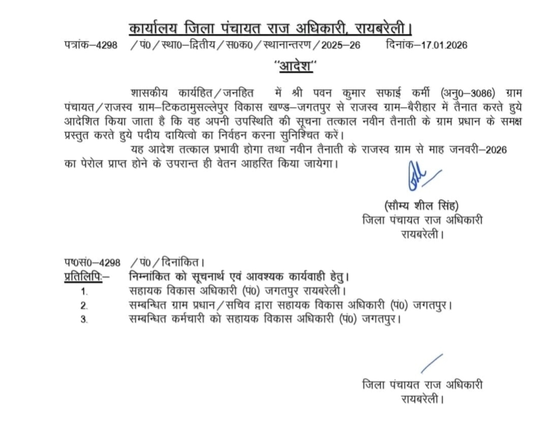 ग्राम पंचायत बैरी हार में लगभग एक वर्ष पूर्व सफाई कर्म चारी मनोज मौर्य के स्थानांतरण के बाद अभी तक कोई सफ़ाई कर्मचारी नहीं नियुक्त हुआ और जब ग्राम प्रधान करन बहादुर सिंह ने कई बार इसकी शिकायत समाधान दिवस में किया तो जिलाधिकारी के निर्देश के बाद जिला पंचायत राज अधिकारी सौम्य शील सिंह ने सफाई कर्मचारी पवन कुमार की नवीन तैनाती बैरीहार की, लेकिन सफाई कर्म चारी पवन कुमार अभी तक बैरीहार में अपनी उपस्थिति नहीं दर्ज कराई है,