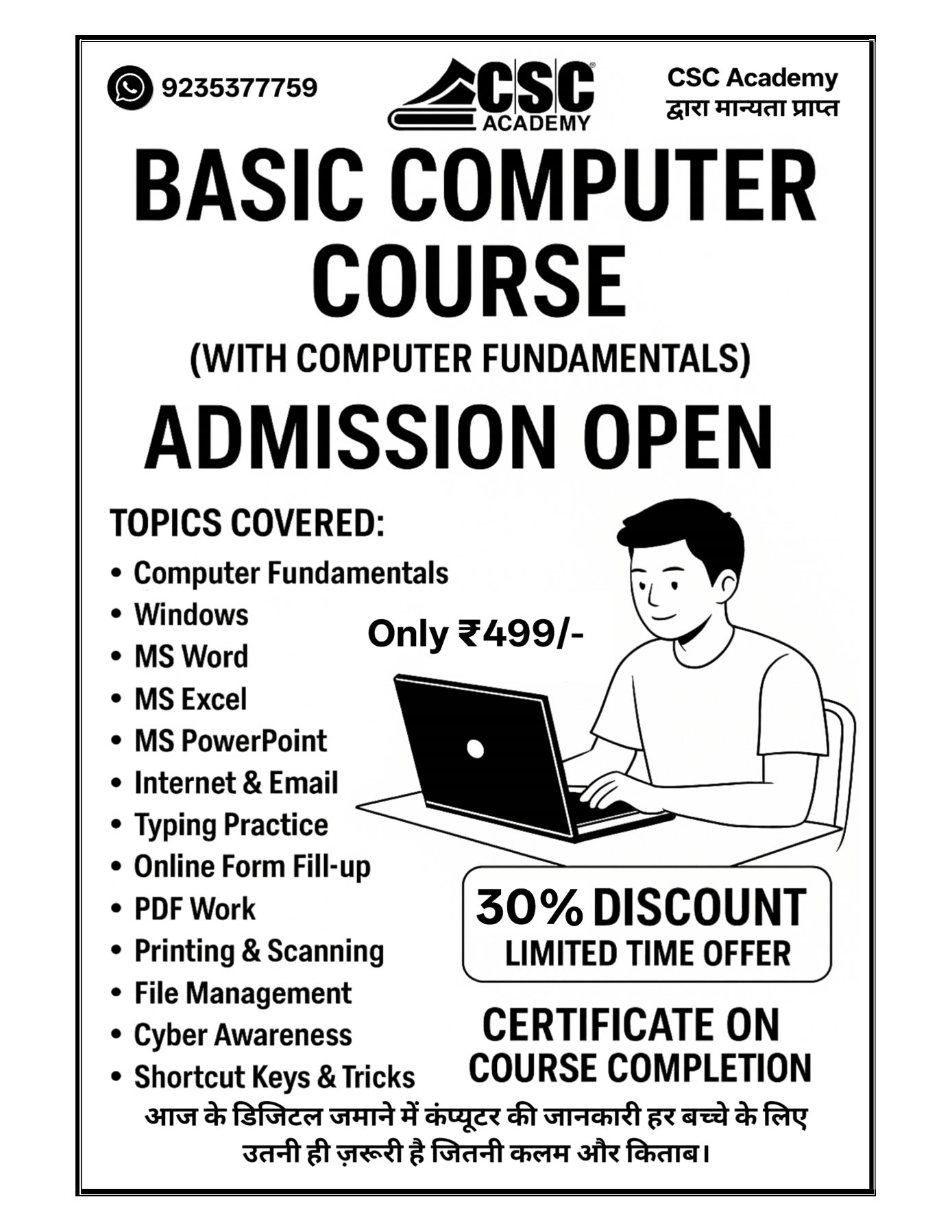 डिजिटल इंडिया की दिशा में युवाओं को तकनीकी रूप से सशक्त बनाने के उद्देश्य से एक सराहनीय पहल की गई है। इसके अंतर्गत अब सर्टिफिकेट के साथ ऑनलाइन बेसिककंप्यूटर कोर्स मात्र 499 रुपये में उपलब्ध कराया जा रहा है। यह योजना विशेष रूप से उन छात्र-छात्राओं और युवाओं के लिए लाभकारी है जो कम खर्च में कंप्यूटर शिक्षा प्राप्त करना चाहते हैं।