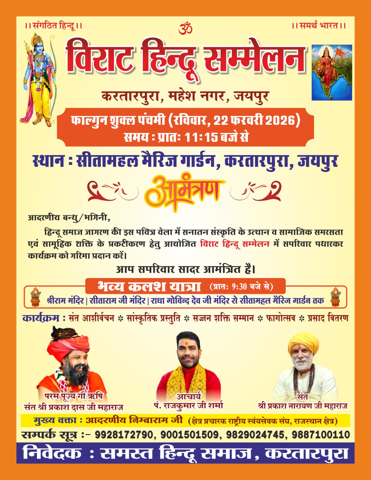 मुख्य सम्मेलन: 22 फरवरी को श्री राम मंदिर परिसर/कार्यक्रम स्थल पर विराट हिंदू सम्मेलन आयोजित होगा।