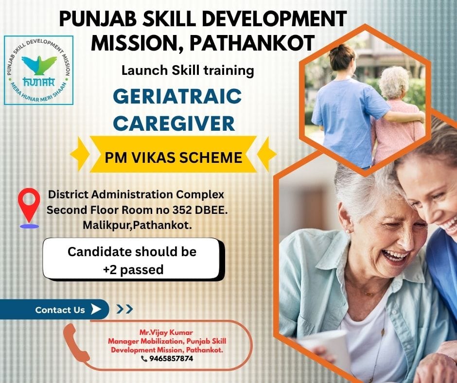 ਪੰਜਾਬ ਹੁਨਰ ਵਿਕਾਸ ਮਿਸ਼ਨ ਵਲੋ "ਪੀ.ਐਮ ਵਿਕਾਸ" ਯੋਜਨਾ ਅਧੀਨ ਜੇਰੀਆਟ੍ਰਿਕ ਕੇਅਰਗਿਵਰ ਦੀ ਮੁਫ਼ਤ ਸਕਿੱਲ ਟੇ੍ਨਿੰਗ।