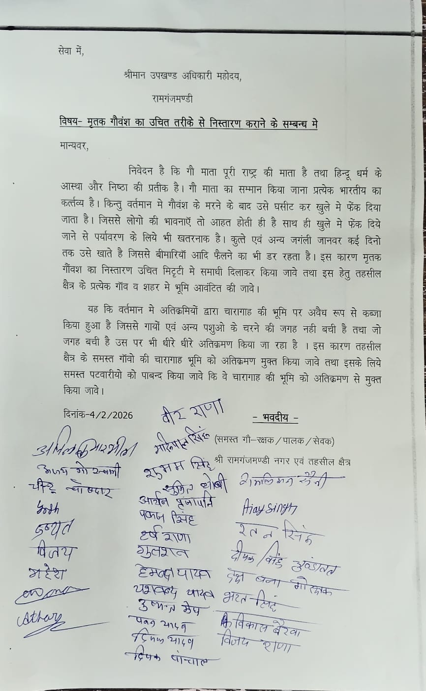 बजरंग दल गौ रक्षक दल द्वारा sdm को दिया ज्ञापन । गौ रक्षकों द्वारा बताया गया कि गाय पूरी राष्ट्र की माता है तथा हिन्दू धर्म के आस्था और निष्ठा की प्रतीक है। गौ माता का सम्मान किया जाना प्रत्येक भारतीय का कर्तव्य है। किन्तु वर्तमान मे गौवंश के मरने के बाद उसे घसीट कर खुले मे फेंक दिया जाता है। जिससे लोगो की भावनाएँ तो आहत होती ही है साथ ही खुले में फेंक दिये जाने से पर्यावरण के लिये भी खतरनाक है। कुत्ते एवं अन्य जगंली जानवर कई दिनो तक उसे खाते है जिससे बीमारियों आदि फैलने का भी डर रहता है। इस कारण मृतक गौवश का निस्तारण उचित मिटूटी मे समाधी दिलाकर किया जावे तथा इस हेतु तहसील क्षेत्र के प्रत्येक गाँव व शहर मे भूमि आवंटित की जावे।