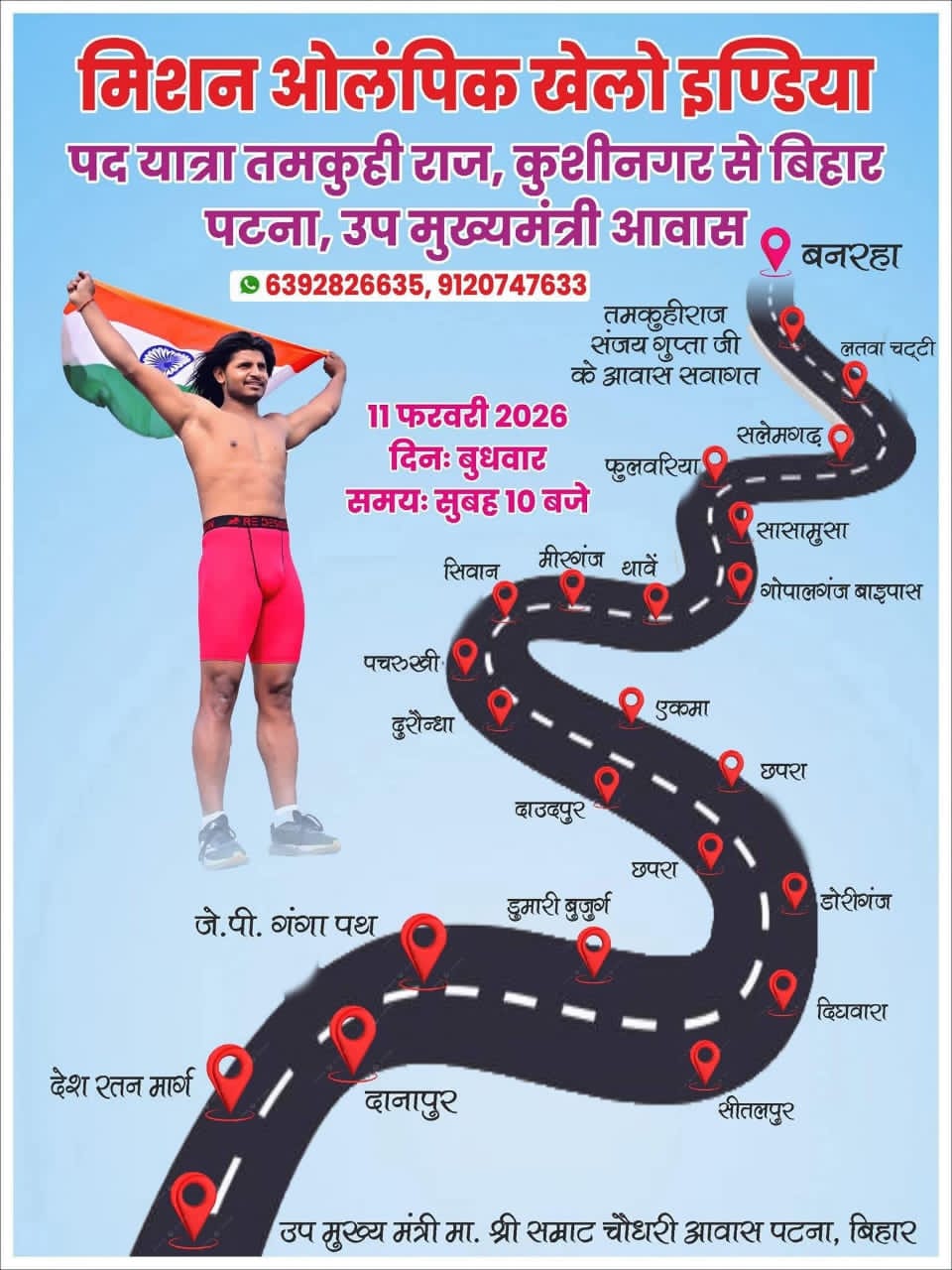 राष्ट्रीय स्तर के एथलीट एवं प्रतिभाशाली धावक रवि मौर्य (स्प्रिंटर) द्वारा युवाओं में खेल चेतना जागृत करने के उद्देश्य से निकाली जा रही ‘युवा खेल जागरण पदयात्रा’ को आज कुशीनगर से बिहार की राजधानी पटना के लिए भव्य रूप से रवाना किया गया। यह प्रेरणादायी पदयात्रा बिहार के उपमुख्यमंत्री सम्राट चौधरी के आवास तक जाएगी, जहां खेल एवं युवा जागरूकता से जुड़ा संदेश सौंपा जाएगा।