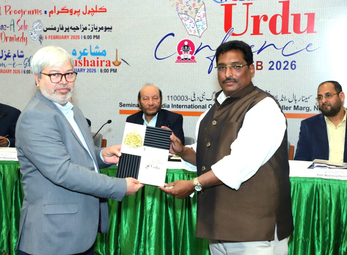 Hyderabad, February 11 (Sarfaraz News Agency). The International Urdu Conference organised by the National Council for the Promotion of Urdu Language (NCPUL) and the Ministry of Education, Government of India, was held in New Delhi. The inauguration of the conference was held at the Prime Minister’s Museum, Teen Murti Marg, Delhi. Special sessions on "Relationship between Urdu and other languages, Indian knowledge system in Urdu, Mushaira, and Evening Ghazal" and under the titles "Great confluence of literature and culture and Urdu language and civilisation in multilingual India" were addressed by prominent personalities of the World Urdu Conference. During these three days, comedy programmes, Ghazal and Mushaira were organised at the Dr M.A. Ansari Auditorium Hall of Jamia Millia Islamia University. Under the supervision of Dr Shams Iqbal, Director, National Council for the Promotion of Urdu Language (NCPUL), Ministry of Education, Government of India, various events were organised. Foreign guests from 16 countries attended the event. Mr Mohammed Abdul Sattar, Member, National Council for the Promotion of Urdu Language (NCPUL), was felicitated for his services to Urdu.
