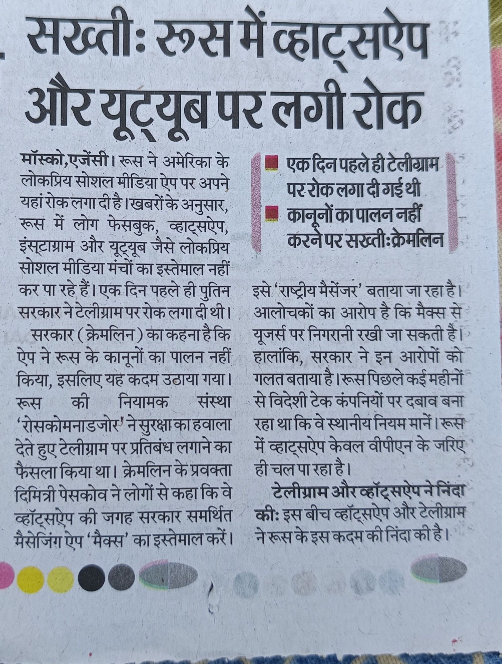 रूस ने अपने देश में social media youtube, facebook, watsapp,estagram,पर प्रतिबंध लगाया और अपना chanal शुरू किया।