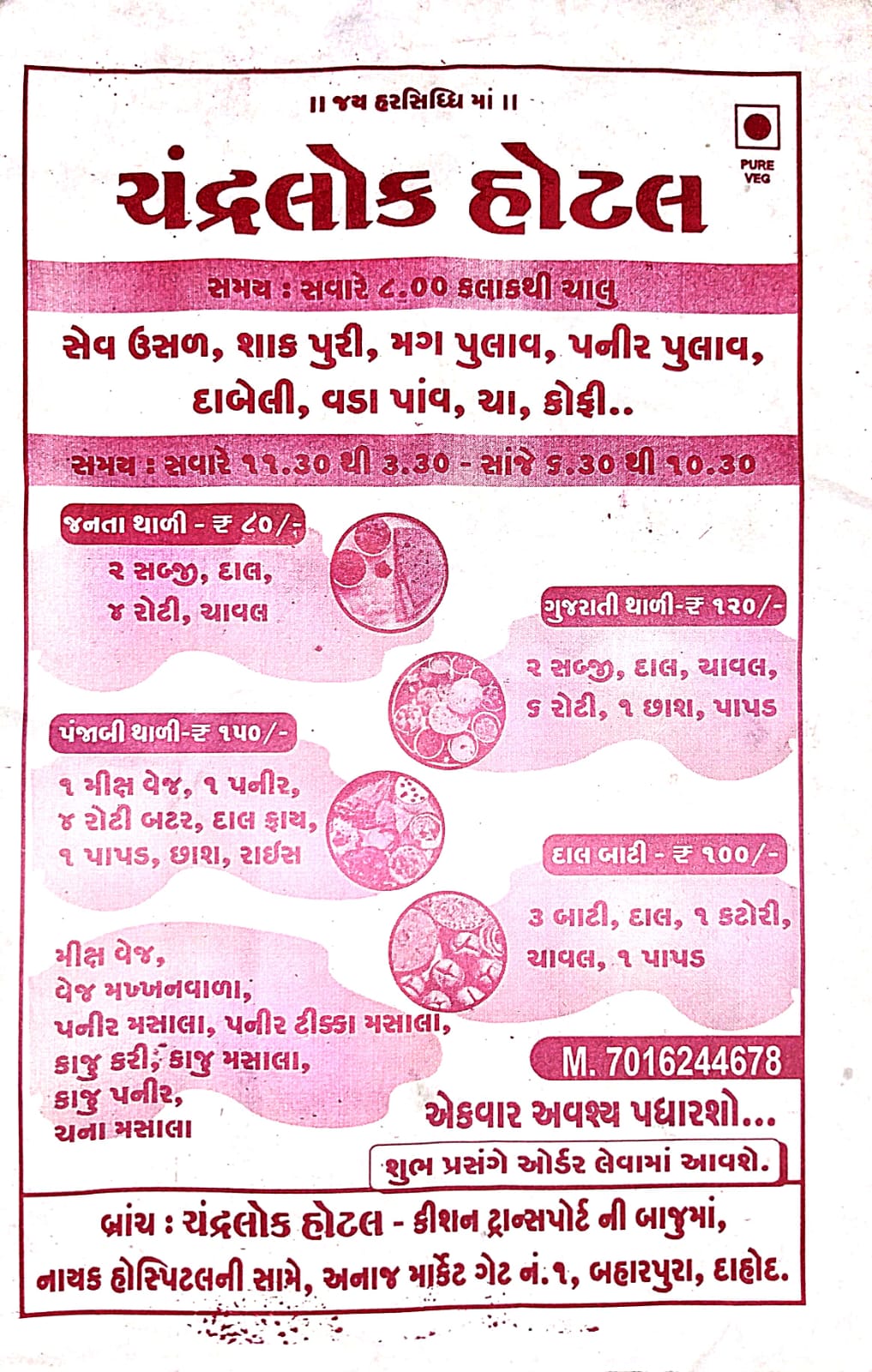 ચંદ્રલોક હોટલ ટાઈમ મોર્નિંગ 08:00 કલાકથી ચાલુ એકવાર અવશ્ય પધારશો... બ્રાન્ચ એડ્રેસ કિશન ટ્રાન્સપોર્ટ ની બાજુમાં નાયક હોસ્પિટલ ની સામે અનાજ માર્કેટ ગેટ નં 1 બહારપુરા દાહોદ. M 7016244678
