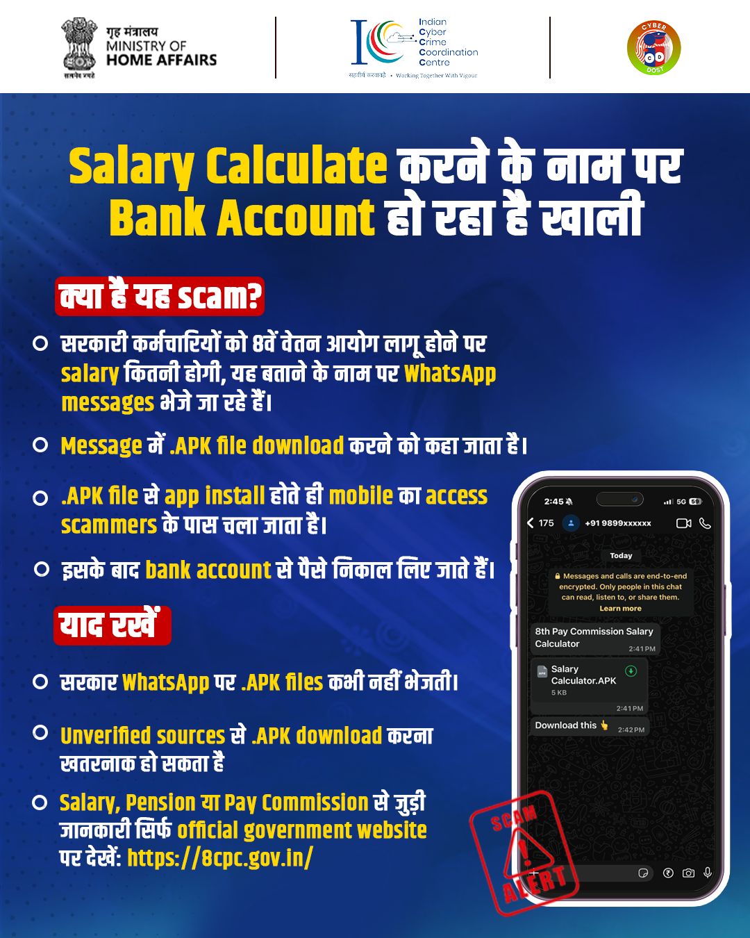 सरकारी कर्मचारियों को WhatsApp पर message भेजकर कहा जा रहा है कि 8वें वेतन आयोग लागू होने पर उनकी salary कितनी होगी, यह जानने के लिए एक APK file download करें.
