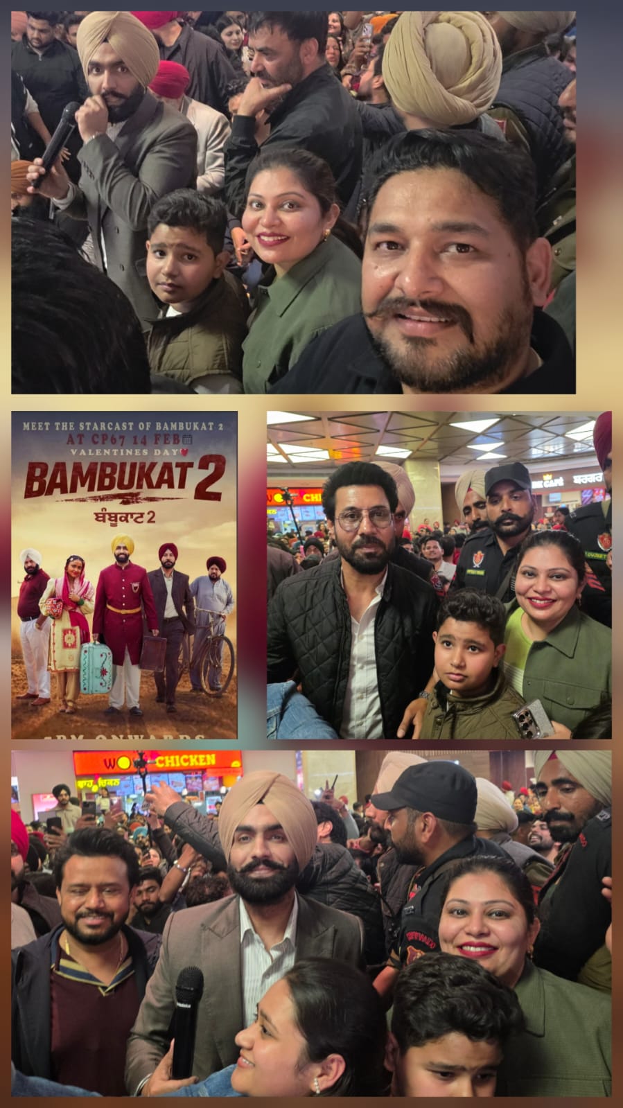 ਫਰੀਦਕੋਟ:14,ਫਰਵਰੀ ( ਕੰਵਲ ਸਰਾਂ) ਅੱਜ ਵੈਲੇਨਟਾਈਨ ਡੇ ਮੌਕੇ ਪੰਜਾਬੀ ਫਿਲਮ ਬੰਬੂਕਾਟ-2 ਦਾ ਸੀ ਪੀ 67 ਮਾਲ ਸੈਕਟਰ 67 ਮੋਹਾਲੀ ਵਿਖੇ ਹੋਇਆ ਸਟਾਰ ਕਾਸਟ ਸ਼ੋਅ । ਇਸ ਸਟਾਰ ਕਾਸਟ ਮੌਕੇ ਤੇ ਪੰਜਾਬੀ ਅਦਾਕਾਰ ਐਮੀ ਵਿਰਕ, ਬੀਨੂੰ ਢਿੱਲੋਂ ਅਤੇ ਕਰਮਜੀਤ ਅਨਮੋਲ ਪਹੁੰਚੇ ਹੋਏ ਸਨ। ਇਸ ਫਿਲਮ ਦੇ ਹੀਰੋ ਐਮੀ ਵਿਰਕ ਤੇ ਹੀਰੋਇਨ ਸਿੰਮੀ ਚਹਿਲ ਹਨ ਇਸ ਤੋ ਇਲਾਵਾ ਗੁਰਪ੍ਰੀਤ ਘੁੱਗੀ ਦਾ ਵੀ ਇਸ ਫਿਲਮ ਵਿੱਚ ਵਿਸ਼ੇਸ਼ ਰੋਲ ਹੈ। ਇਹ ਫਿਲਮ ਪ੍ਰੀਵਾਰਕ ਫਿਲਮ ਹੈ। ਇਸ ਫਿਲਮ ਦੇ ਸਟਾਰ ਕਾਸਟ ਮੌਕੇ ਫਰੀਦਕੋਟ ਤੋਂ ਵਿਸ਼ੇਸ਼ ਸੱਦੇ ਤੇ ਰੌਬੀ ਬਬਰਾ ਨੇ ਪ੍ਰੀਵਾਰ ਸਮੇਤ ਸ਼ਿਰਕਤ ਕੀਤੀ। ਰੌਬੀ ਬਬਰਾ ਜੋ ਕਿ ਇੱਕ ਬਿਜ਼ਨਸਮੈਨ ਦੇ ਨਾਲ ਨਾਲ ਪੰਜਾਬ ਦੀ ਸਿਆਸਤ ਵਿੱਚ ਵੀ ਸਰਗਰਮ ਹਨ। ਰੌਬੀ ਬਬਰਾ ਦੇ ਸਪੁੱਤਰ ਸ਼ਿਵਅੰਸ਼ ਨੇ ਸਟਾਰ ਕਾਸਟ ਸ਼ੋਅ ਤੇ ਜਾ ਕੇ ਖੂਬ ਆਨੰਦ ਮਾਣਿਆ। ਇਸ ਬੰਬੂਕਾਟ-2 ਦੇ ਸਟਾਰ ਕਾਸਟ ਮੌਕੇ ਪਹੁੰਚੇ ਕਰਮਜੀਤ ਅਨਮੋਲ ਜੋ ਸਫਲ ਅਦਾਕਾਰ ਦੇ ਨਾਲ ਇੱਕ ਸਿਆਸਤਦਾਨ ਵੀ ਹਨ ਤੇ ਪੰਜਾਬ ਦੇ ਮੁੱਖ ਮੰਤਰੀ ਸ. ਭਗਵੰਤ ਸਿੰਘ ਮਾਨ ਦੇ ਬਹੁਤ ਹੀ ਨਜ਼ਦੀਕੀਆਂ ਵਿੱਚੋਂ ਨਿੱਘੇ ਸੁਭਾਅ ਦੇ ਮਾਲਕ ਹਨ। ਐਮੀ ਵਿਰਕ ਦੀਆਂ ਪੰਜਾਬੀ ਫਿਲਮ ਹਮੇਸ਼ਾ ਪਰਿਵਾਰਕ ਹੁੰਦੀਆ ਹਨ। ਬੰਬੂਕਾਟ-2 ਇੱਕ ਪੰਜਾਬੀ ਦੀ ਫ਼ਿਲਮ ਹੈ ਜੋ ਪੰਕਜ ਬੱਤਰਾ ਨੇ ਨਿਰਦੇਸ਼ਤ ਕੀਤਾ। ਇਸ ਫ਼ਿਲਮ ਨੂੰ ਜੱਸ ਗਰੇਵਾਲ ਨੇ ਲਿੱਖਿਆ ਅਤੇ ਐਮੀ ਵਿਰਕ, ਬੀਨੂੰ ਢਿੱਲੋਂ, ਸਿਮੀ ਚਹਿਲ,ਕਰਮਜੀਤ ਅਨਮੋਲ ਅਤੇ ਗੁਰਪ੍ਰੀਤ ਗੁੱਘੀ ਦੀ ਵਿਸ਼ੇਸ਼ ਭੂਮਿਕਾ ਹੈ।