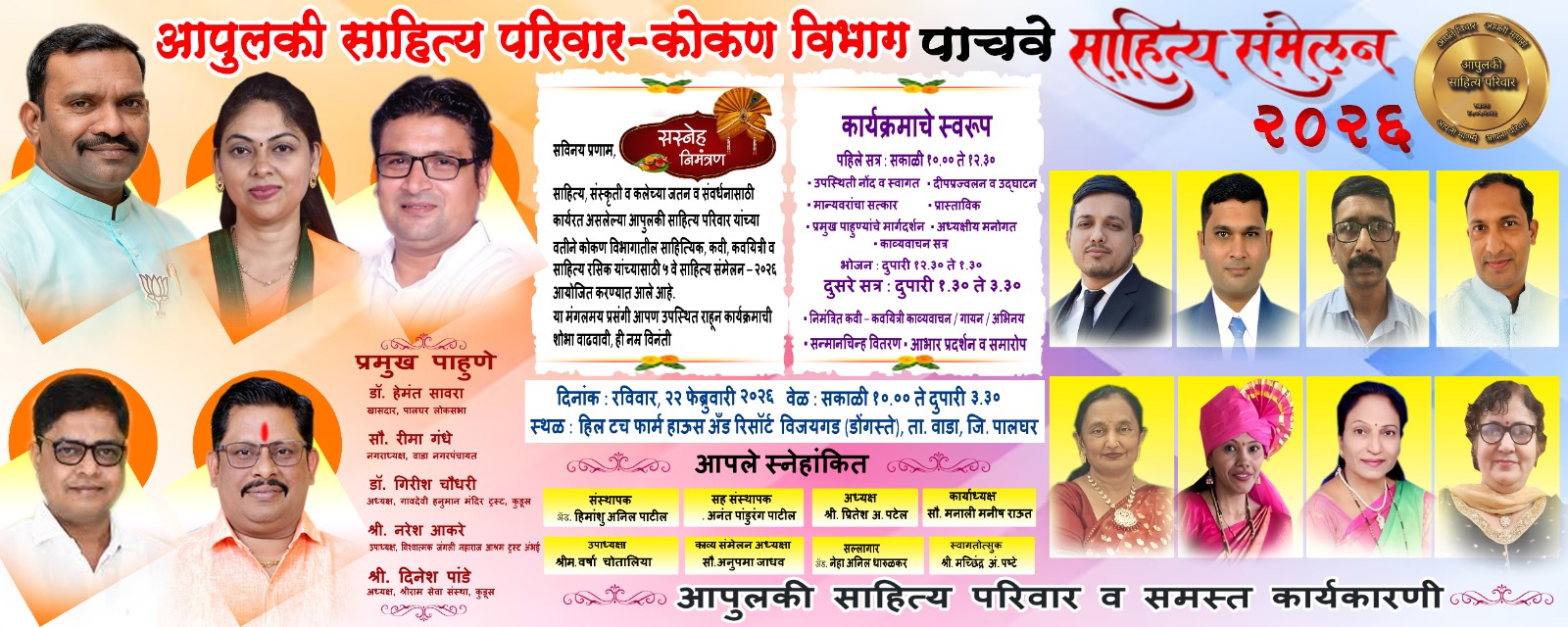 रविवार, दिनांक २२ फेब्रुवारी रोजी हिल टच फार्म हाऊस अँड रिसॉर्ट, विजयगड (ता. वाडा) येथे हे साहित्य संमेलन उत्साहात संपन्न होणार आहे. या संमेलनास खासदार डॉ. हेमंत सावरा, नगराध्यक्ष सौ. सीमा गंधे, डॉ. गिरीश चौधरी, नरेश आकटे, दिनेश पांडे आदी मान्यवर प्रमुख पाहुणे म्हणून उपस्थित राहणार आहेत.