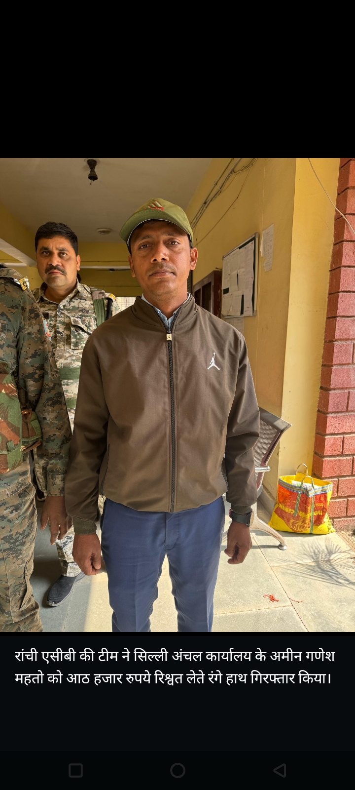 सिल्ली : निगरानी की टीम ने बड़ी कार्रवाई करते हुए सिल्ली अंचल कार्यालय में कार्यरत अमीन गणेश महतो को आठ हजार रुपये रिश्वत लेते रंगे हाथों गिरफ्तार किया है। अमीन के गिरफ्तारी के बाद सिल्ली अंचल कार्यालय में हड़कंप मच गया है। ग्रामीणों ने निगरानी टीम की इस कार्रवाई को सराहा है।