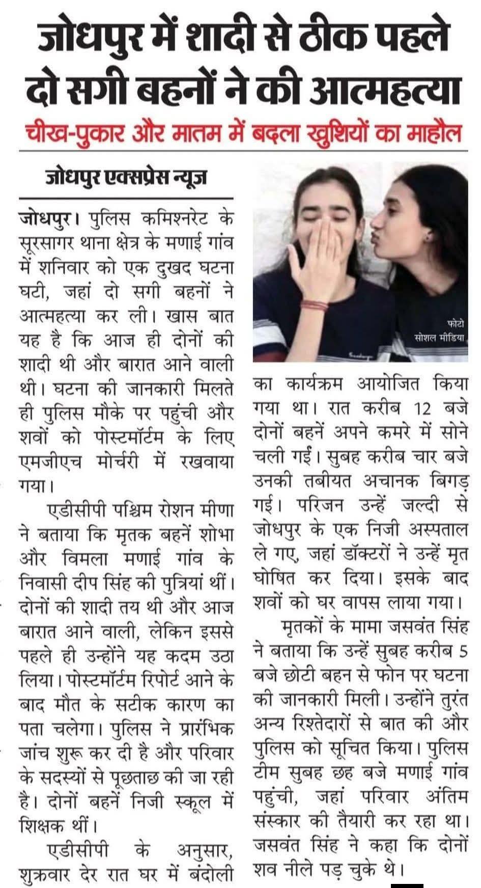 जोधपुर में शादी से ठीक पहले दो सगी बहनों ने की आत्महत्या