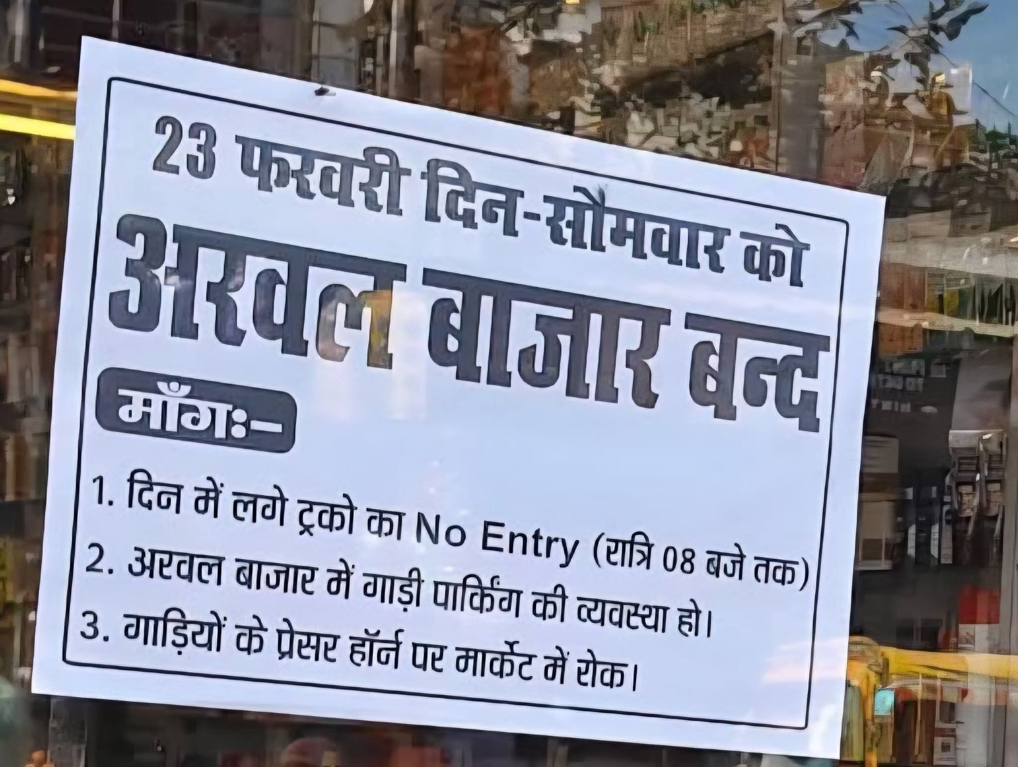 कल दिनांक 23/02/2026 बिहार के अरवल जिला के अरवल बाजार पूर्ण रूप से बन्द रहेगा.। बाजार बंद का कारण है अरवल में पूरी तरह से फोर लाइन की ना रहने के कारण अरवल बाजार में गाड़ियों की लंबी जाम कतार लाइन में लगे रहते हैं इसे अरवल की जनता आने-जाने में स्कूल के बच्चों की गाड़ियां कई घंटे तक जाने फंसे रहते हैं और बाजार में दुकानदारों को दुकानदारी करने में दिक्कत होती है। इसलिए पूरी बाजार कल बंद रहेगा।