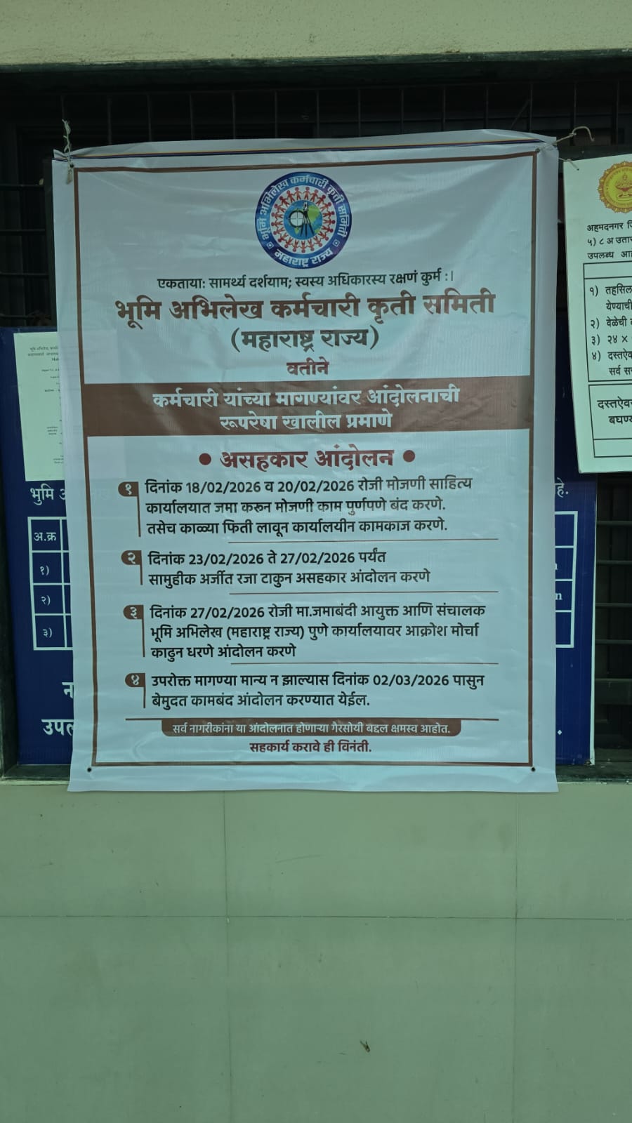 तांत्रिक वेतनश्रेणी आणि प्रलंबित मागण्यांसाठी महाराष्ट्र राज्य भूमी अभिलेख विभागाच्या कर्मचाऱ्यांनी १८ फेब्रुवारी २०२६ पासून राज्यव्यापी असहकार व कामबंद आंदोलन सुरू केले आहे. मोजणी साहित्य जमा करणे, सामूहिक रजा, आणि बेमुदत संपाचा इशारा दिल्यामुळे राज्यातील जमीन मोजणीची कामे पूर्णपणे ठप्प झाली असून नागरिकांची मोठी गैरसोय होत आहे.