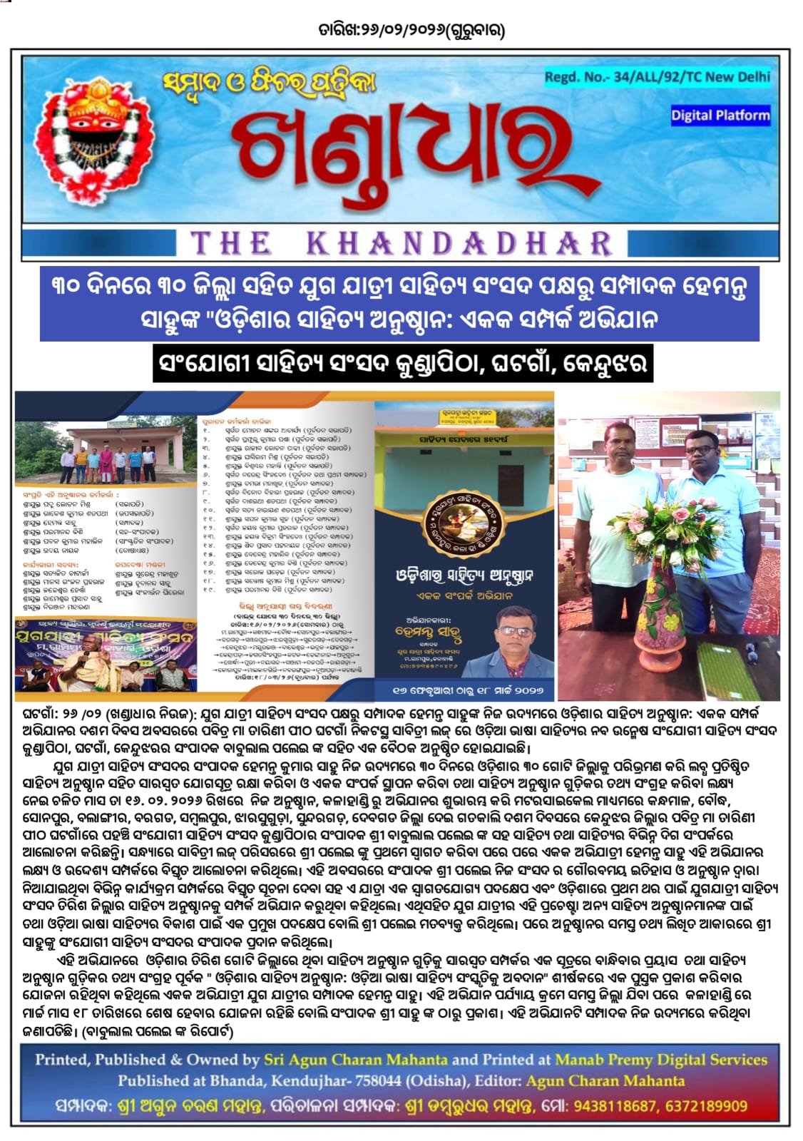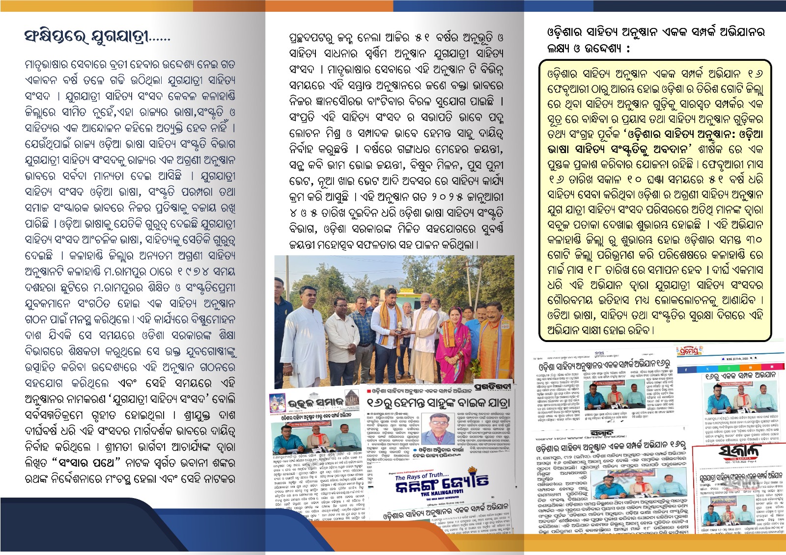 ୩୦ ଦିନରେ ୩୦ ଜିଲ୍ଲା ସହିତ ଯୁଗ ଯାତ୍ରୀ ସାହିତ୍ୟ ସଂସଦ ପକ୍ଷରୁ ସମ୍ପାଦକ ହେମନ୍ତ ସାହୁଙ୍କ "ଓଡ଼ିଶାର ସାହିତ୍ୟ ଅନୁଷ୍ଠାନ: ଏକକ ସମ୍ପର୍କ ଅଭିଯାନ