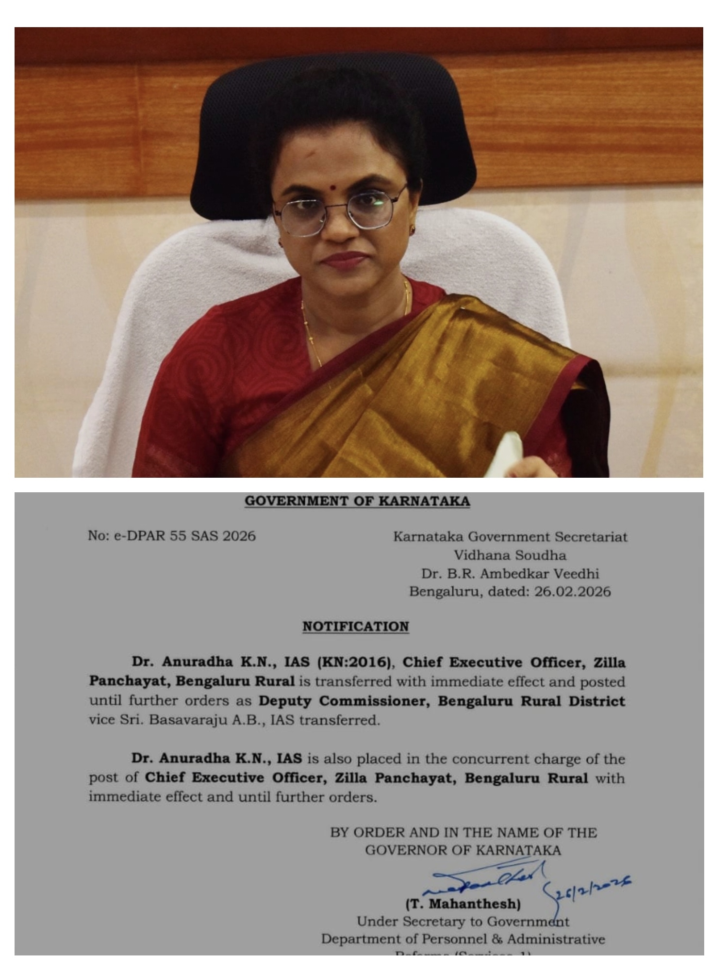 ಬೆಂಗಳೂರು ಗ್ರಾಮಾಂತರ ಜಿಲ್ಲೆಯ ಜಿಲ್ಲಾಧಿಕಾರಿ ಬಸವರಾಜು.ಎ.ಬಿ ಅವರ ವರ್ಗಾವಣೆಯಿಂದಾಗಿ ಜಿಲ್ಲಾ ಪಂಚಾಯಿತಿ ಮುಖ್ಯ ಕಾರ್ಯನಿರ್ವಹಣಾಧಿಕಾರಿಯಾಗಿ ಕರ್ತವ್ಸಯ ಸಲ್ಲಿಸುತ್ತಿದ್ದ ಡಾ.ಕೆ.ಎನ್.ಅನುರಾಧ ಅವರನ್ನು ಜಿಲ್ಲಾಧಿಕಾರಿಯಾಗಿ ಜಿಲ್ಲೆಗೆ ನೇಮಕ ಮಾಡಲಾಗಿದೆ. ಹಾಗೂ ಮುಂದಿನ ಆದೇಶದವರೆಗೆ ಜಿಲ್ಲಾ ಪಂಚಾಯಿತಿ ಮುಖ್ಯ ಕಾರ್ಯನಿರ್ವಹಣಾಧಿಕಾರಿಯಾಗಿ ಮುಂದುವರೆಯಲಿದ್ದಾರೆ.