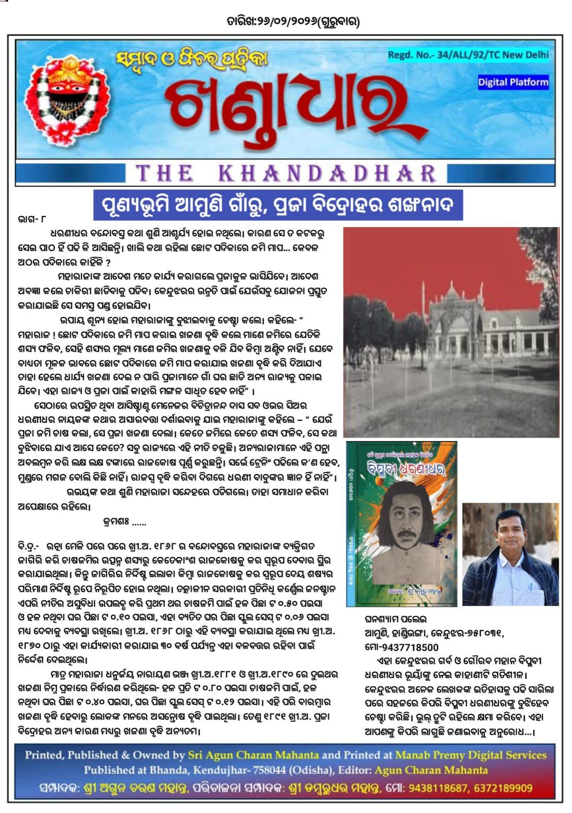 ଏହା କେନ୍ଦୁଝରର ଗର୍ବ ଓ ଗୌରବ ମହାନ ବିପ୍ଳବୀ ଧରଣୀଧର ଭୂୟାଁଙ୍କୁ ନେଇ କାହାଣୀଟି ଗତିଶୀଳ। କେନ୍ଦୁଝରର ଅନେକ ଲେଖକଙ୍କ ଇତିହାସକୁ ପଢି ସାରିଲା ପରେ ସହଜରେ କିପରି ବିପ୍ଳବୀ ଧରଣୀଧରଙ୍କୁ ବୁଝିହେବ ଚେଷ୍ଟା କରିଛି। ଭୁଲ୍ ତ୍ରୁଟି ରହିଲେ କ୍ଷମା କରିବେ। ଏହା ଆପଣଙ୍କୁ କିପରି ଲାଗୁଛି ଜଣାଇବାକୁ ଅନୁରୋଧ...।
