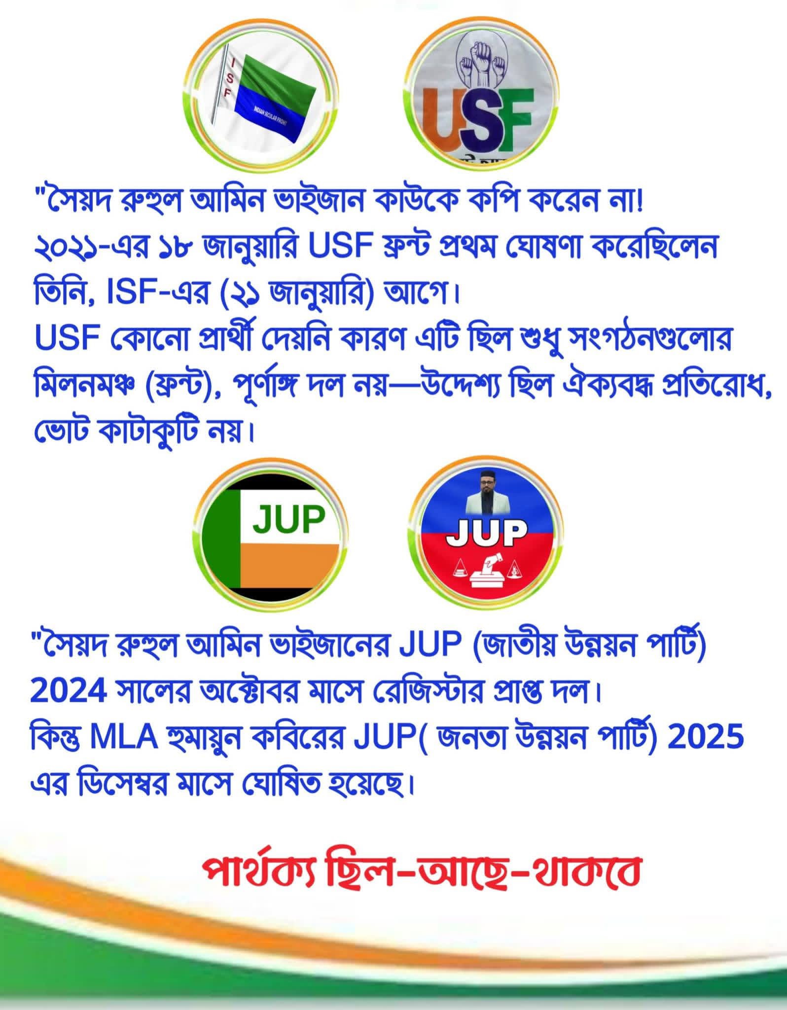 আর JUP-এর কথা? জাতীয় উন্নয়ন পার্টি (JUP) ভাইজান ২০২৪ সালের অক্টোবর মাসেই রেজিস্টার করে রেখেছিলেন—হুমায়ূন কবিরের জনতা উন্নয়ন পার্টি (JUP) ২০২৫-এর ডিসেম্বরে ঘোষিত হয়েছে!