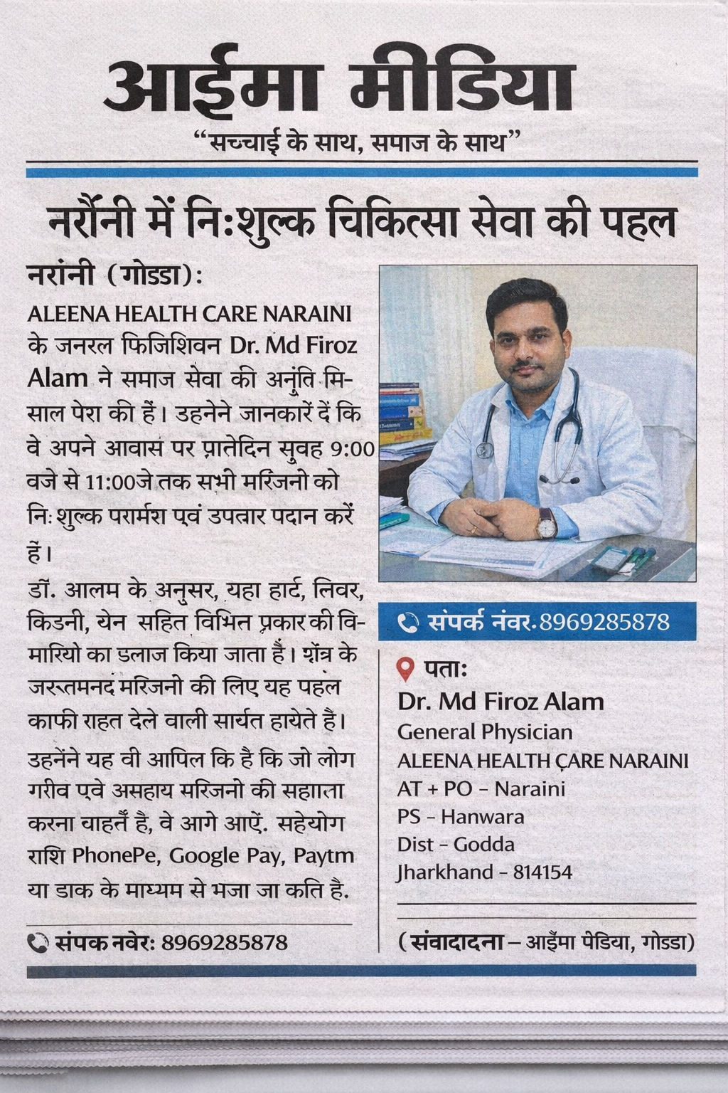 ALEENA HEALTH CARE NARAINI के जनरल फिजिशियन Dr. Md Firoz Alam ने समाज सेवा की अनूठी मिसाल पेश की है। उन्होंने जानकारी दी कि वे अपने आवास पर प्रतिदिन सुबह 9:00 बजे से 11:00 बजे तक सभी मरीजों को नि:शुल्क परामर्श एवं उपचार प्रदान कर रहे हैं।