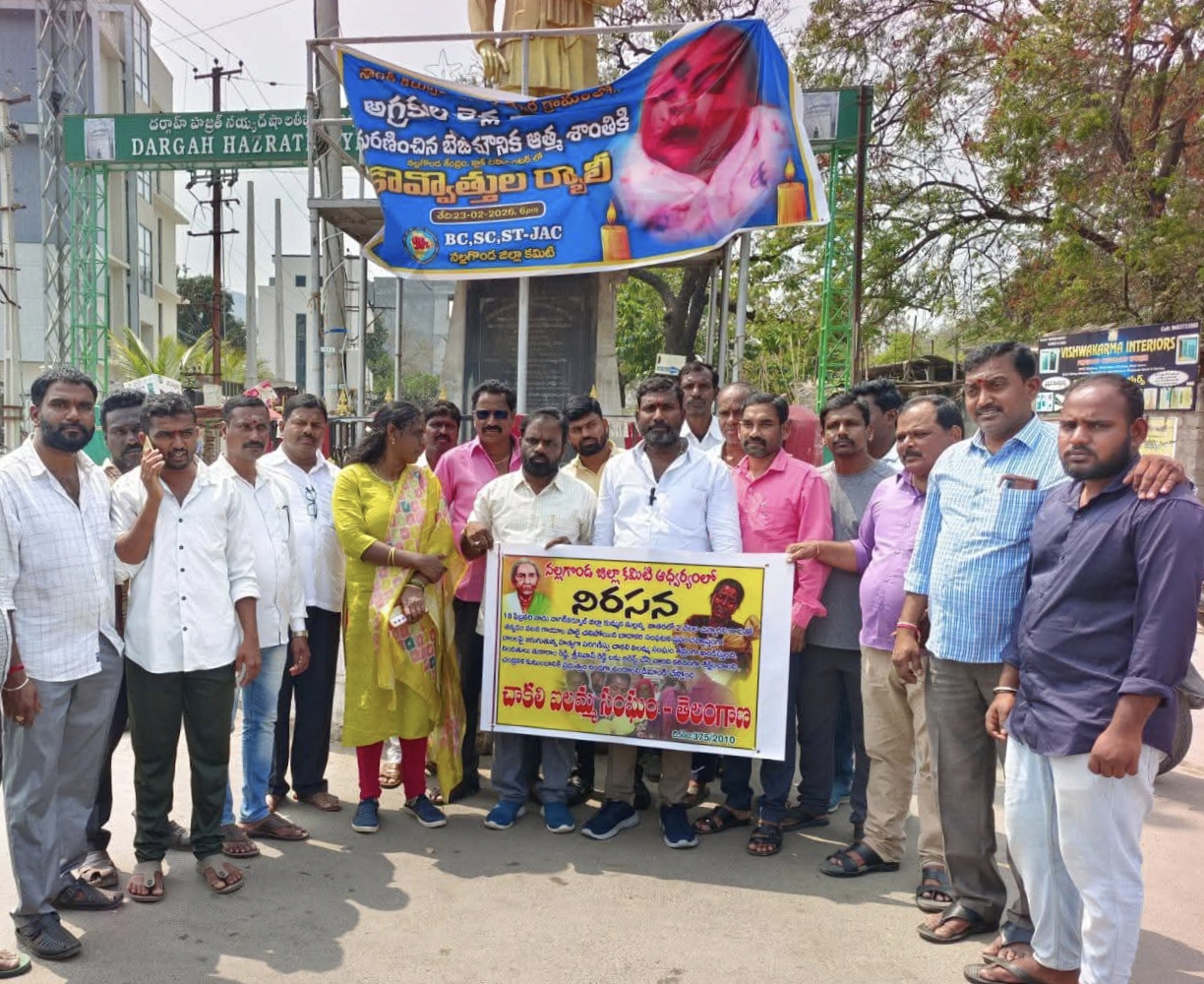 నల్లగొండ: నల్లగొండ జిల్లా కేంద్రంలోని క్లాక్ టవర్ సెంటర్లో గురువారం రోజు చా.ఐ.స నల్లగొండ జిల్లా అధ్యక్షులు ఎలిజల శంకర్ ఆధ్వర్యంలో నిర్వహించిన నిరసన కార్యక్రమానికి చాకలి ఐలమ్మ సంఘం తెలంగాణ ఫౌండర్ చైర్మన్ రచయిత ఐదారి శంకర్ ముఖ్యఅతిథిగా పాల్గొని నాగర్ కర్నూల్ జిల్లా కుమ్మెర గ్రామంలో 2026 ఫిబ్రవరి 18న జరిగిన మల్లన్న జాతరలో చికిలేశ్వరం గణేష్,