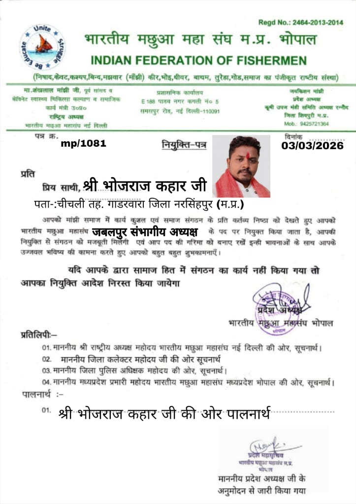 हम सभी युवाओं, महिलाओं, लड़कियों, बच्चों एवं बुजुर्गों से विनम्र अनुरोध करते हैं कि आप सब भारतीय मछुआ महासंघ मध्यप्रदेश से जुड़कर समाज के उत्थान, सांस्कृतिक संरक्षण और नई पीढ़ी के उज्ज्वल भविष्य निर्माण में अपनी सक्रिय भागीदारी निभाएं।