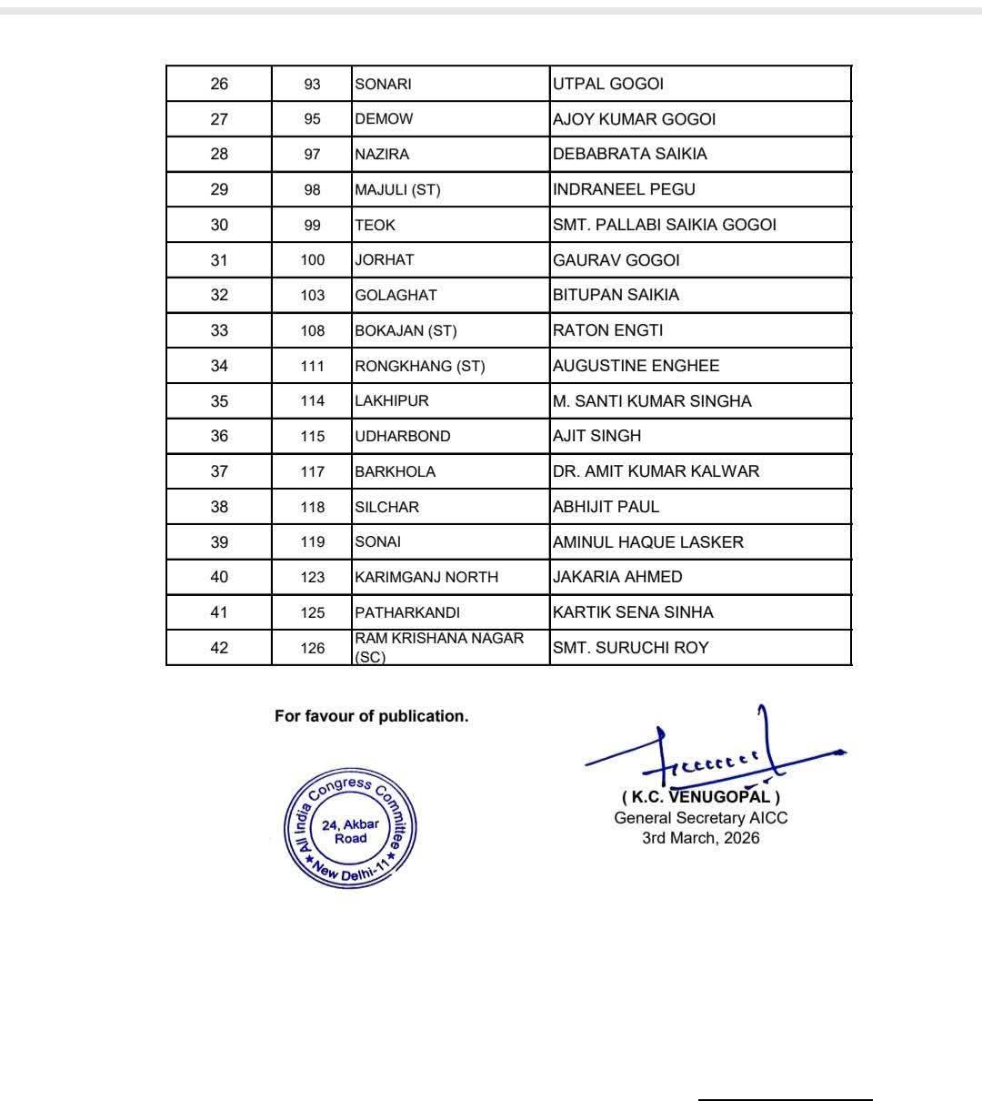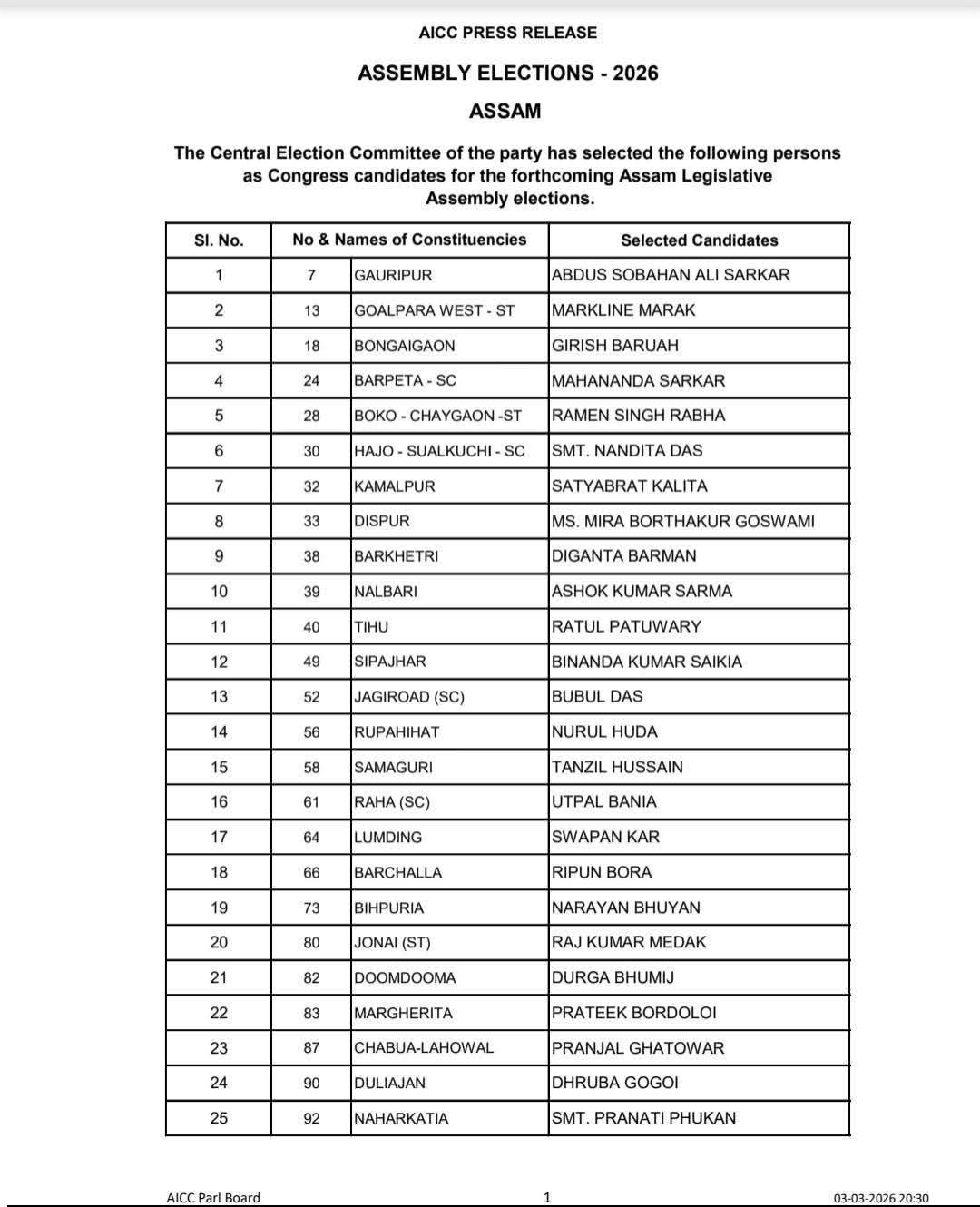 The first phase of candidates for the 2026 Assam Legislative Assembly Election has been announced by the Indian National Congress.