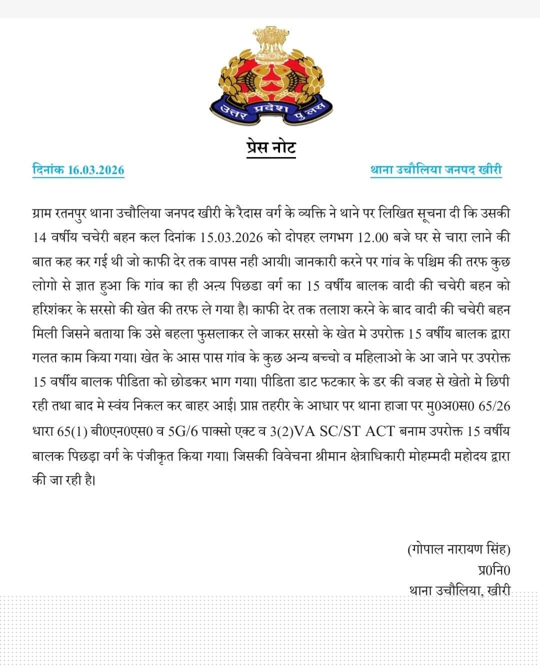 उचौलिया में चारा लेने खेत गई दलित किशोरी से रेप