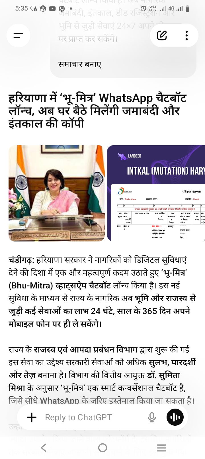हरियाणा में ‘भू-मित्र’ WhatsApp चैटबॉट लॉन्च, अब घर बैठे मिलेंगी जमाबंदी और इंतकाल की कॉपी