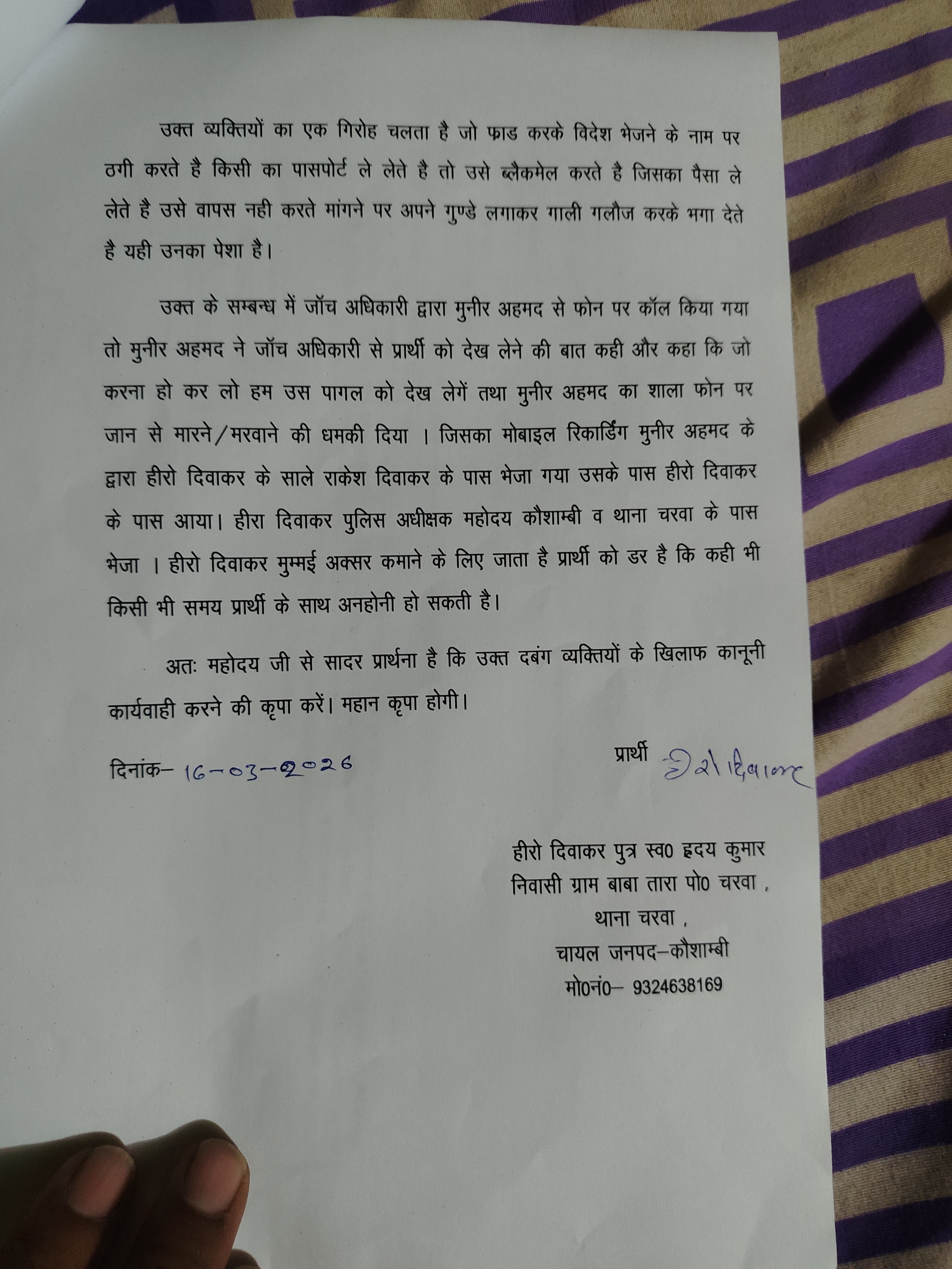श्रीमान कौशम्बी पुलिस आधिछक महोदय जनपद कौशम्बी महोदय जीFIR, 0016/ BNS, 316(2) के तहत एजेंट मुनीर अहमद अंसारी के खिलाफ चरवा थाना में दर्ज किया गया है महोदय जी IGRS संख्या 20017426000814 में, आख्या16/026 धारा 316/318(4) BNS में पंजीकृत किया जा रहा है दिखाया गया है महोदय जी पैसे का धारा 316(2) तो ठीक है लेकिन पासपोर्ट को जाल साजिश के तहत गवन करना 318(4) लगना नयहित में आवश्यक है महोदय जी जांच विवेचना रमाकांत त्रिपाठी महोदय जी के द्वारा मुनीर अहमद अंसारी को काल किया गया तो मुनीर अहमद अंसारी और उसके सालेने हीरो दिवाकर को देख लेने और जान से मारने मरवाने कि धमकी दिया जाता है महोदय जी मुनीर अहमद अंसारी और उसके साले का हीरो दिवाकर के पास काल रिकॉर्डिंग साबुत के तौर पर मौजूद है महोदय जी चरवा थाना महोदय जी को वटसाप पे भेज दिया गया है लेकिन अभी तक कोई ठोस कार्यवाही नहीं किया गया है महोदय जी से अनुरोध है कि उचित कार्यवाही और विवेचना में अभी तक कोई ठोस विवेचना नहीं किया गया महोदय जी से अनुरोध है कि ईस दिसा में आप संगयान लेने की कृपा करें हीरो दिवाकर मनवाधिकार समाज कल्याण सचिव कौशम्बी उत्तर प्रदेश