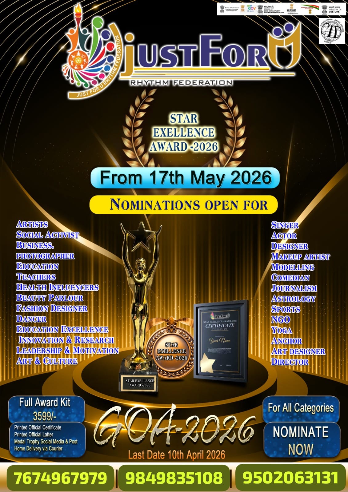 JUST FOR U RHYTHM FEDERATION STAR EXCELLENCE AWARDS 2026 @GOA ON 17th May 2025 5pm program More details pls 9849835107