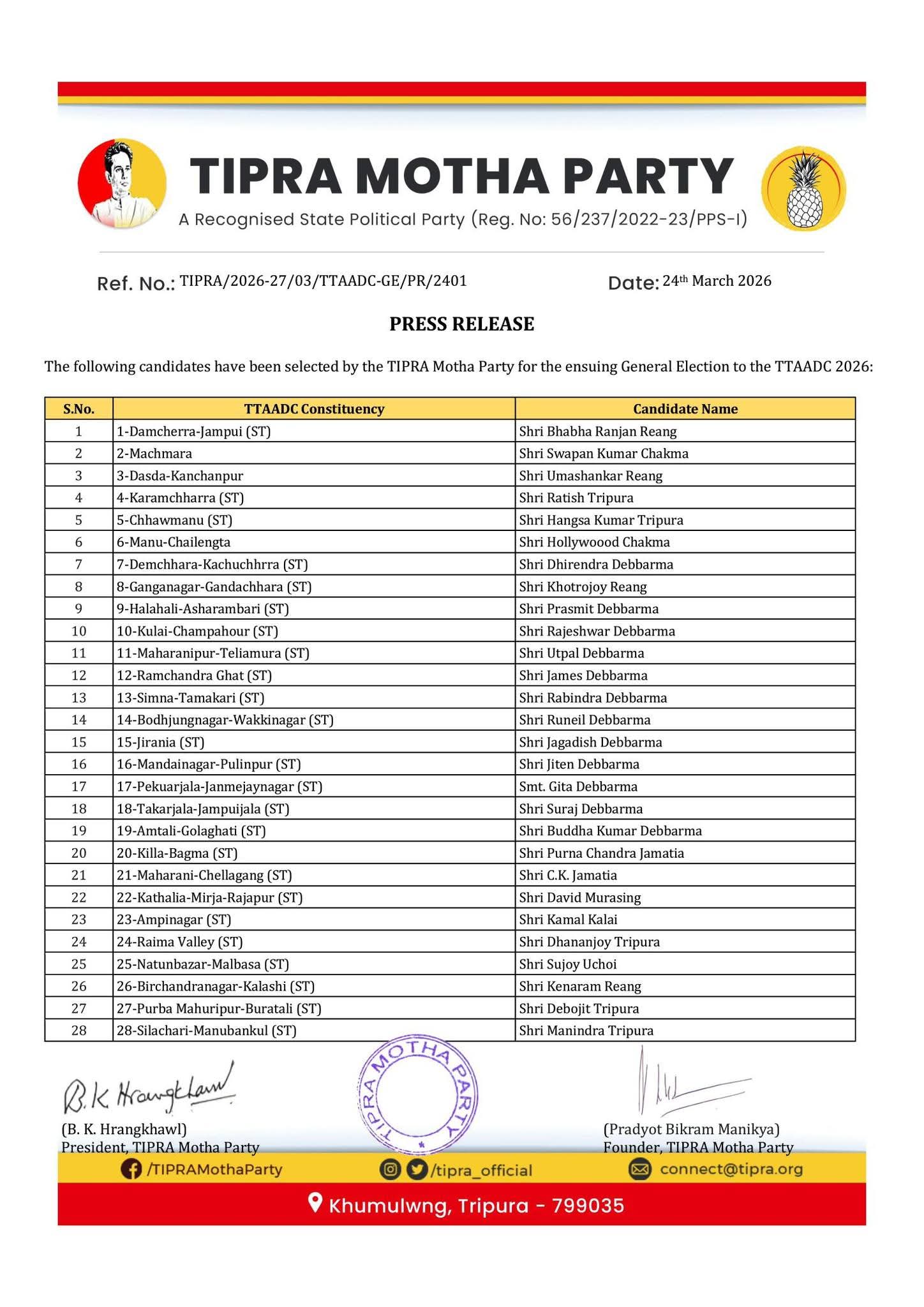 Tipra motha party, announced all candidate name TTAADC elections in tripura