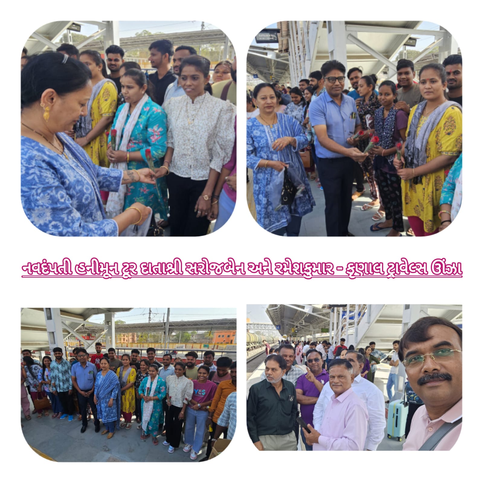 સમૂહલગ્નમાં પવિત્ર બંધનમાં જોડાયેલા 18 નવદંપતિઓને હનીમૂન ટુરનું પેકેજ *દાતાશ્રી શ્રીમતી સરોજબેન તથા શ્રી રમેશકુમાર ઈશ્વરલાલ લીલાચંદ સથવારા* તરફથી ભેટરૂપે આપવામાં આવ્યું હતું. આ અનુસંધાને તા. 14-03-2026ના રોજ સવારે 10:00 વાગ્યે મહેસાણા રેલવે સ્ટેશને તમામ નવદંપતિઓ આનંદ અને ઉત્સાહ સાથે ઉપસ્થિત રહ્યા હતા. આ પ્રસંગે દાતાશ્રી તેમજ ટ્રસ્ટી મંડળના સભ્યો ખાસ હાજર રહી નવદંપતિઓને શુભેચ્છાઓ પાઠવી હતી. દાતાશ્રી સરોજબેન અને રમેશભાઈ દ્વારા નવદંપતિઓને પુષ્પગુચ્છ અર્પણ કરી તથા કોલ્ડ્રિન્ક આપી હાર્દિક આશીર્વાદ આપવામાં આવ્યા હતા. ટ્રસ્ટી મંડળના સભ્યો અને સમાજના આગેવાનો દ્વારા પણ નવદંપતિઓને હેપ્પી અને સેફ જર્નીની શુભકામનાઓ પાઠવવામાં આવી હતી.