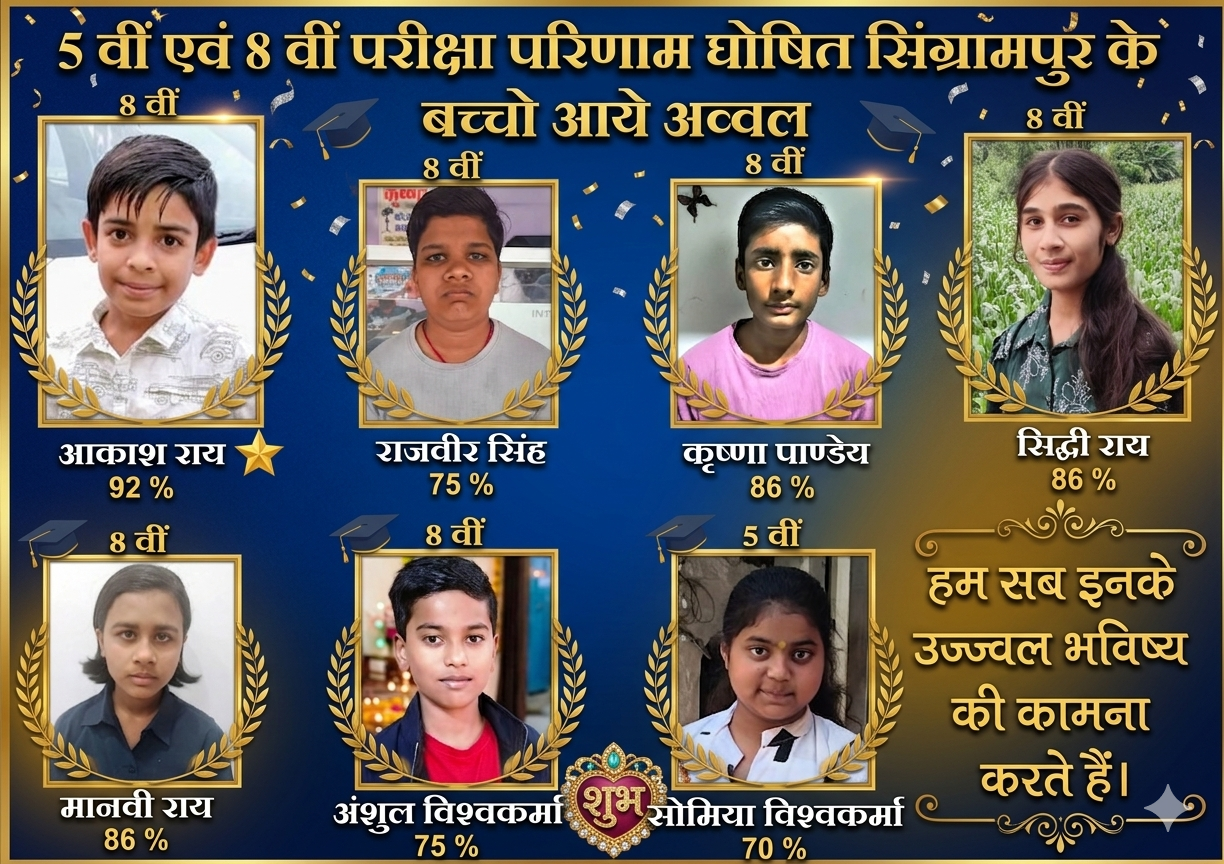 सिंग्रामपुर: सिंग्रामपुर क्षेत्र के लिए यह एक बहुत ही गर्व और खुशी का मौका है। हाल ही में घोषित हुए कक्षा 5वीं और 8वीं के परीक्षा परिणामों में यहां के बच्चों ने जबरदस्त प्रदर्शन किया है। अपनी मेहनत और लगन से इन्होंने साबित कर दिया है कि वे किसी से कम नहीं हैं।