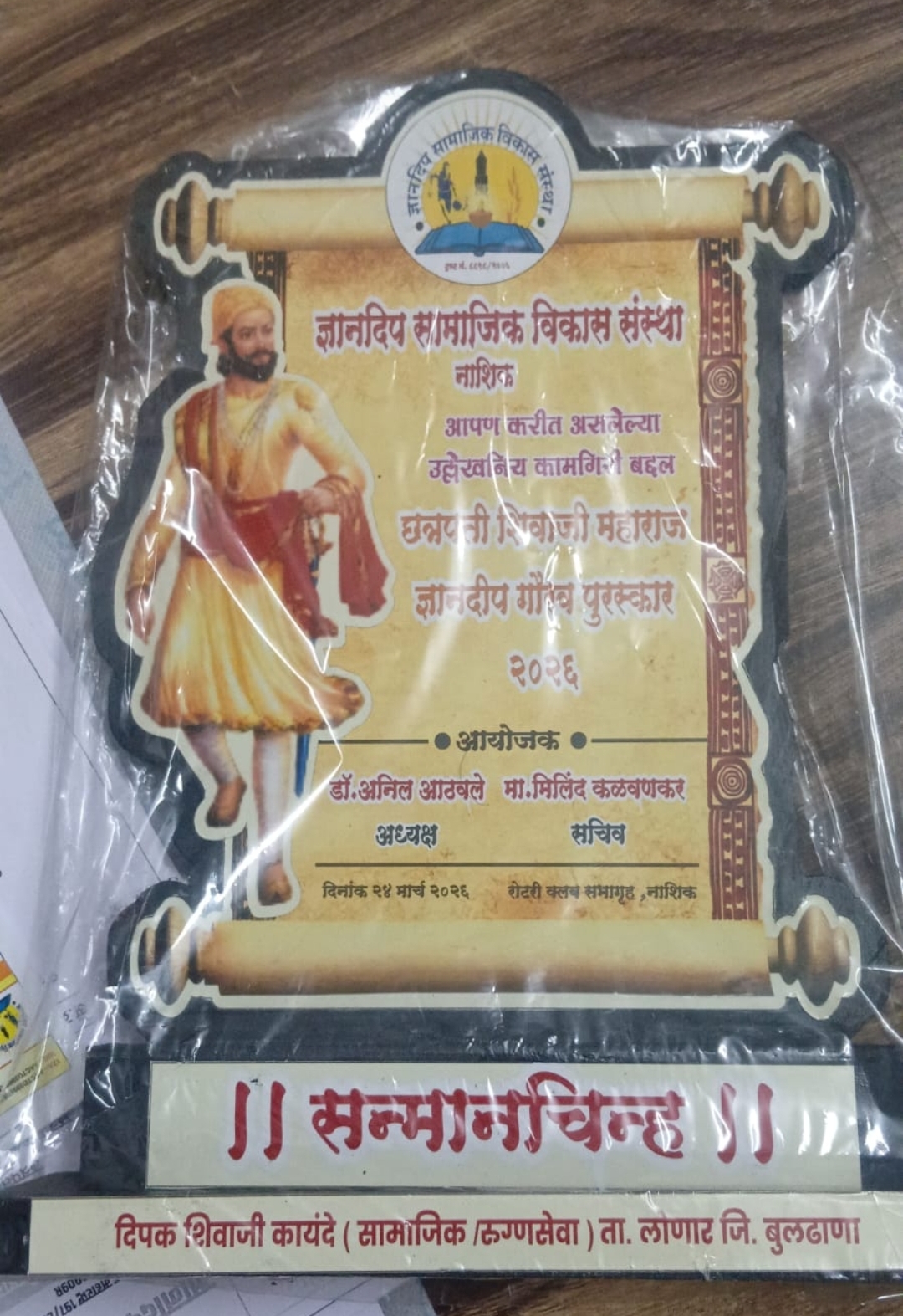आपल्या निस्वार्थ सामाजिक सेवेच्या माध्यमातून जनसामान्यांच्या समस्यांना वाचा फोडणारे आणि रुग्णसेवेचा वसा घेतलेले श्री. दिपक शिवाजी कायंदे यांना २०२६ चा प्रतिष्ठित 'छत्रपती शिवाजी महाराज ज्ञानदीप गौरव पुरस्कार' जाहीर करण्यात आला आहे. नाशिक येथील ज्ञानदीप सामाजिक विकास संस्थेच्या वतीने त्यांच्या उल्लेखनीय कार्याचा गौरव करण्यात येणार आहे.