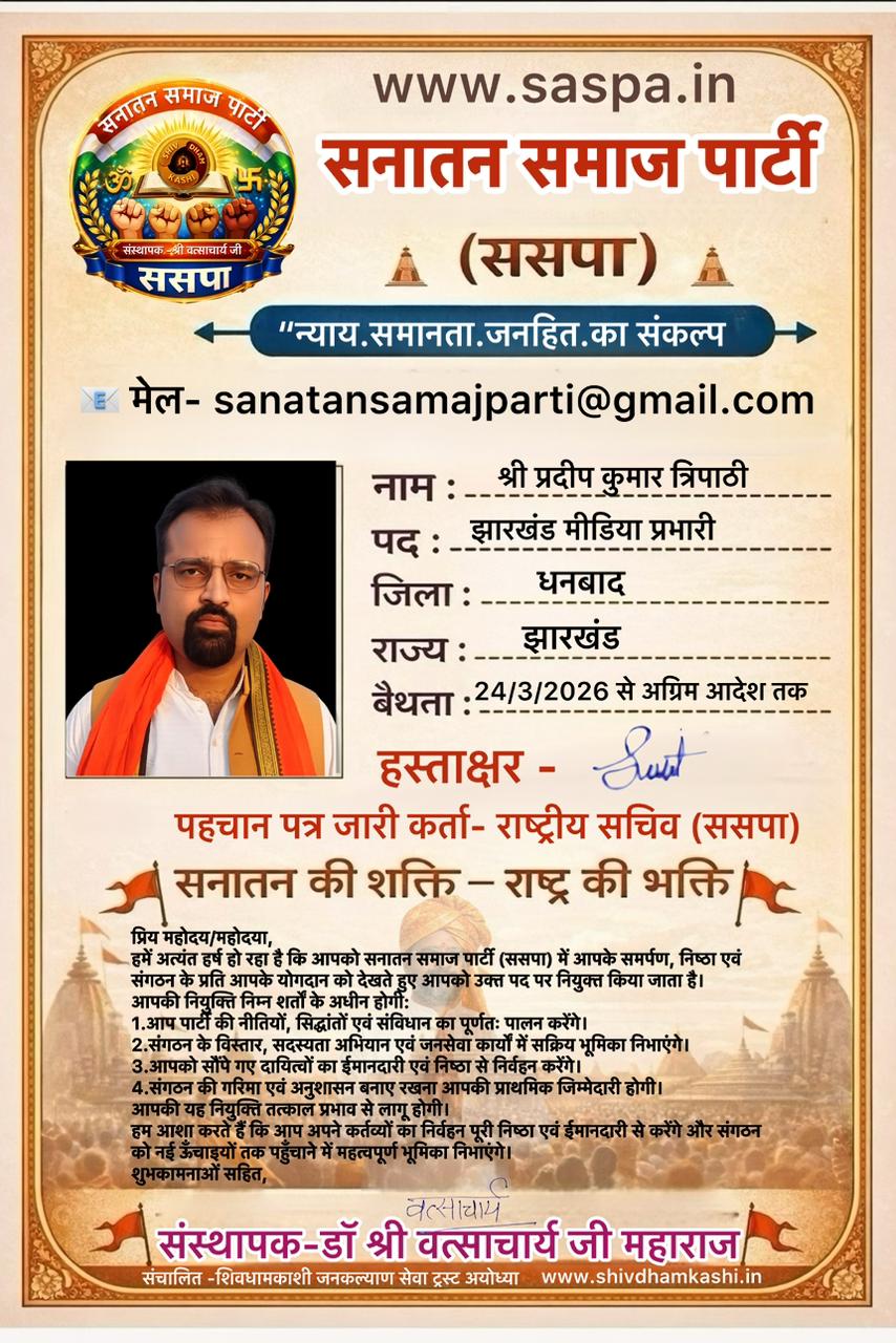 सनातन समाज पार्टी (ससपा) ने श्री प्रदीप कुमार त्रिपाठी को झारखंड का मीडिया प्रभारी नियुक्त किया