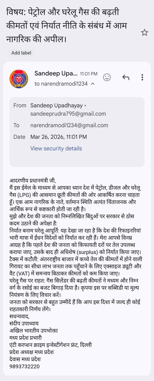 ​देश में बढ़ती महंगाई और पेट्रोल-डीजल के साथ घरेलू गैस (LPG) की आसमान छूती कीमतों को लेकर एंटी करप्शन क्राइम इन्वेस्टीगेशन फ्रंट (दिल्ली) के मध्य प्रदेश अध्यक्ष और अखिल भारतीय उपभोक्ता मध्य प्रदेश प्रभारी संदीप उपाध्याय ने प्रधानमंत्री नरेंद्र मोदी को ईमेल भेजकर आम जनता के पक्ष में कड़ी अपील की है।