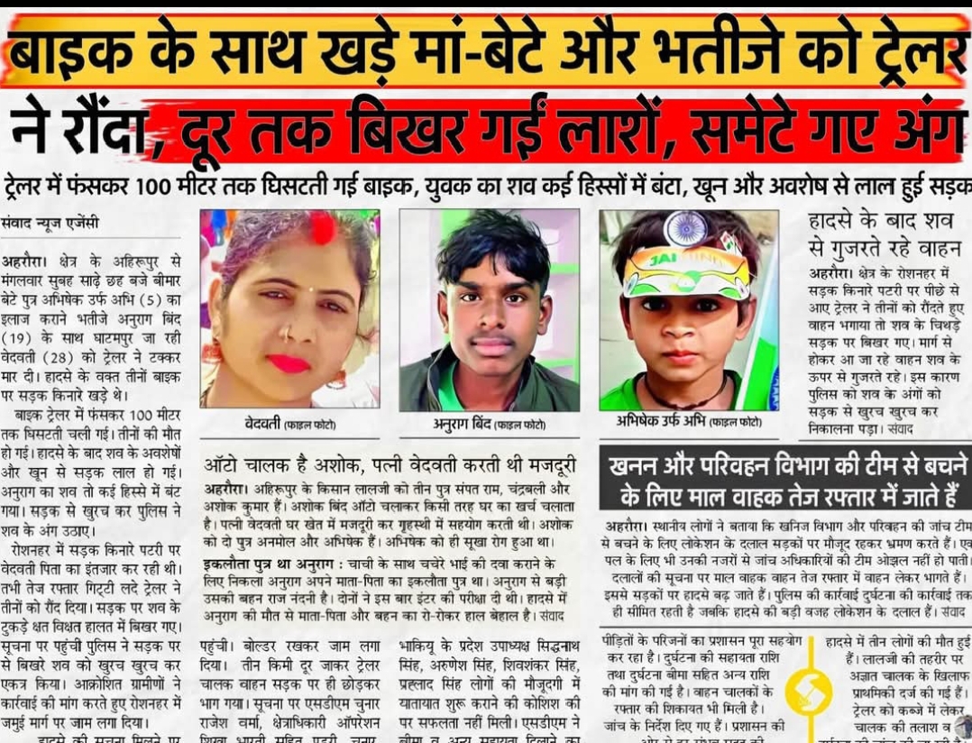 ЁЯУ░ рдорд┐рд░реНрдЬрд╛рдкреБрд░: рдЯреНрд░реЗрд▓рд░ рдХреА рдЯрдХреНрдХрд░ рд╕реЗ рдорд╛рдВ, рдмреЗрдЯреЗ рдФрд░ рднрддреАрдЬреЗ рдХреА рдореМрдд, рд╕рдбрд╝рдХ рд╣рд╛рджрд╕реЗ рд╕реЗ рдордЪрд╛ рд╣рдбрд╝рдХрдВрдк