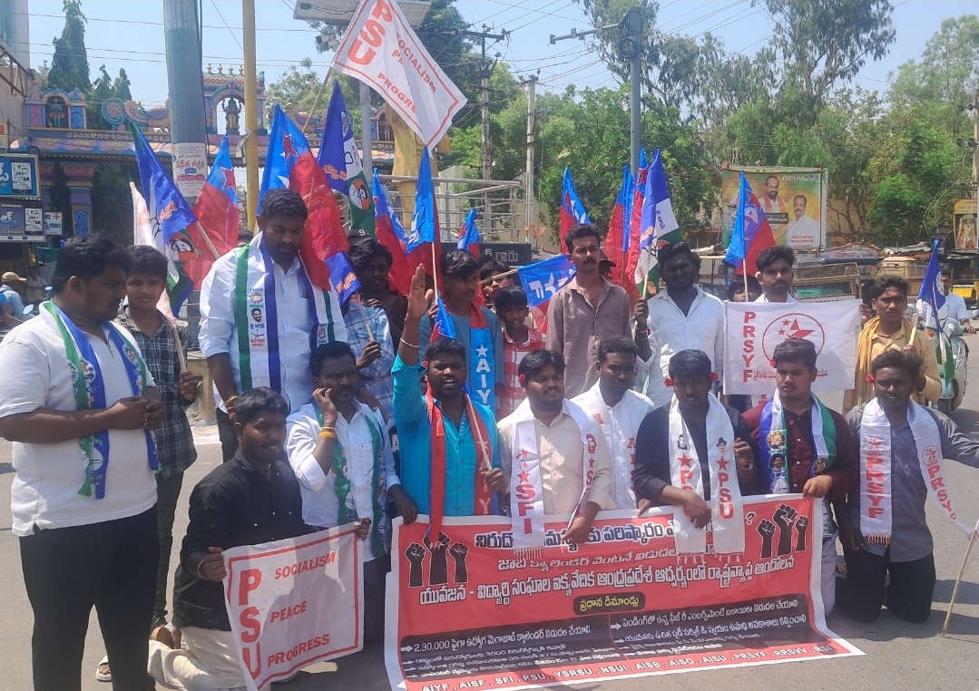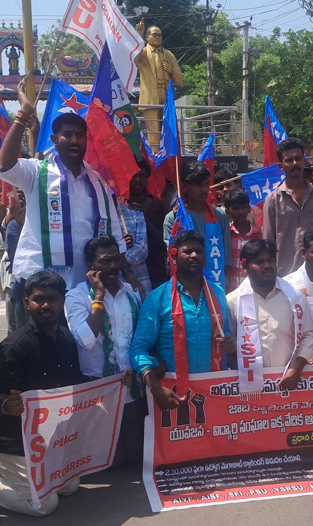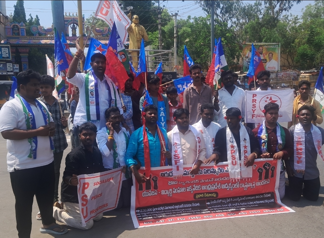 ఆంధ్రప్రదేశ్ రాష్ట్రంలో ఎన్నికల సందర్భంగా నిరుద్యోగులకు 3000 రూపాయలు నిరుద్యోగ భృతి ఇస్తామని వాగ్దానం చేశారు ప్రభుత్వ ఏర్పడి 25 నెలలు కావస్తున్నప్పటికీ నిరుద్యోగులకు ఇచ్చిన మాట నిలబెట్టుకోకపోవడంతో రాష్ట్రంలోని యువకులు అలాగే ప్రభుత్వం అధికారంలోకి వచ్చిన వెంటనే రాష్ట్రంలో ఉన్నటువంటి ఖాళీలను భర్తీ చేస్తామని అందరికీ ఉద్యోగం ఉపాధి కల్పిస్తామని హామీ ఇచ్చారు ఇప్పటివరకు జాబ్ మేళాకు సంబంధించి క్యాలెండర్ను విడుదల చేయకపోవడం ఉన్నత విద్యను అభ్యసించిన వేలాదిమంది ఉద్యోగ ఉపాధి అవకాశాలు లేక ఇబ్బందులు పడుతున్న పరిస్థితుల్లో అటు విద్యార్థులు నిరుద్యోగులు ఒకటై విద్యార్థి యువజన ఐక్య సంఘం పేరుతో రాష్ట్రవ్యాప్తంగా ఆందోళన చేస్తున్నారు ఇందులో భాగంగా శ్రీ సత్య సాయి జిల్లా ధర్మవరం పట్టణంలో వైయస్సార్ ఎస్ యు జిల్లా నాయకులు పురుషోత్తం రాయల్. అమర్నాథ్ రెడ్డి. పట్టణ అధ్యక్షుడు వాల్మీకి విష్ణు. పిఆర్ఎస్ వైఫ్ జిల్లా అధ్యక్షుడు సాయినాథ్ రెడ్డి.ఏఐయుఎస్ఓ జిల్లా అధ్యక్షుడు దామోదర్ ఆంబేధ్కర్ విగ్రహం ఎదుట ఉదయం 11 గంటలకు ఆందోళన చేశారు ఈ సందర్భంగా వారు మాట్లాడుతూ లక్షలాదిమంది ఉన్నత విద్యను అభ్యసించిన యువతకు ఉద్యోగ అవకాశాలు లేవని దాదాపు 2.30 లక్షల ఖాళీలను భర్తీ చేయాల్సి ఉందని అలాగే పోలీసు డిపార్ట్మెంట్లో 19 ఉద్యోగాలు ఖాళీగా ఉన్నాయని వీటిని భర్తీ చేయడానికి మెగా జాబ్ క్యాలెండర్ను రాష్ట్ర ప్రభుత్వం విడుదల చేయాలని డిమాండ్ చేశారు