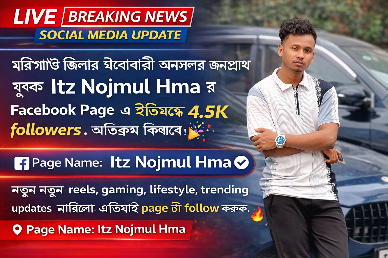 বেলোবৰি গাঁৱৰ যুৱক ন’জমুল হকৰ নতুন Facebook Page, ৰাইজক Follow কৰাৰ আহ্বান মৰিগাঁওৰ মৈৰাবাৰীত যুৱকৰ নতুন উদ্যোগ, Facebook Page খুলি লাভ কৰিছে সঁহাৰি