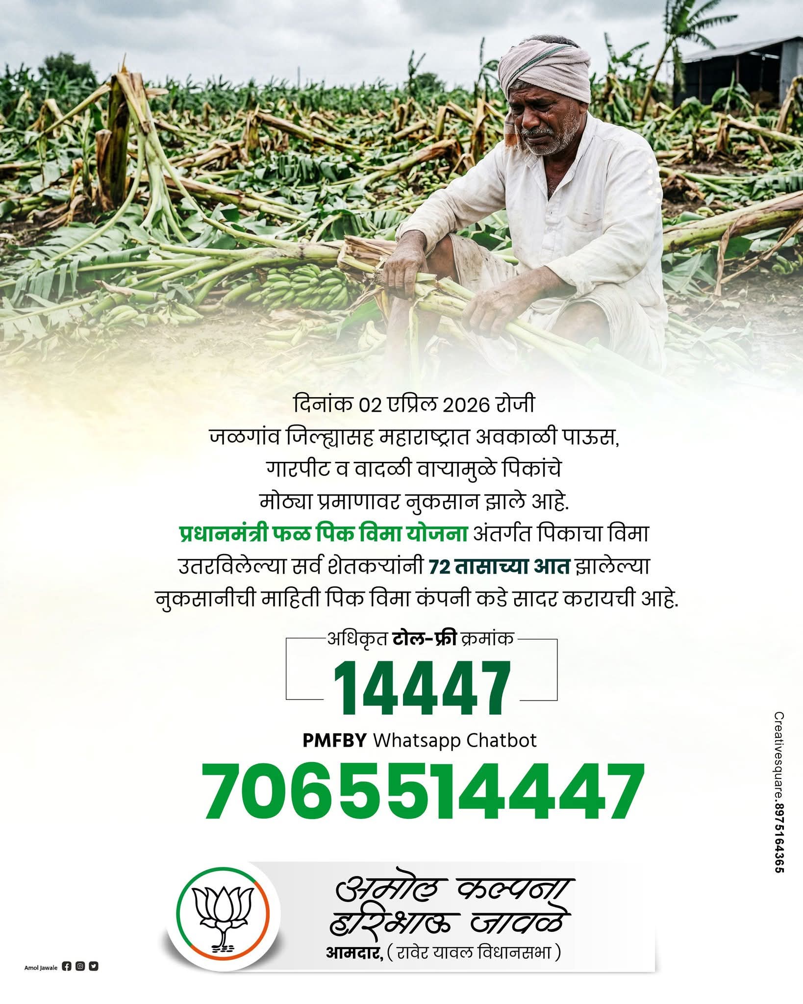 दिनांक ०२ एप्रिल २०२६ रोजी जळगाव जिल्ह्यासह महाराष्ट्रात अवकाळी पाऊस, गारपीट व वादळी वाऱ्यामुळे पिकांचे मोठ्या प्रमाणावर नुकसान झाले आहे.