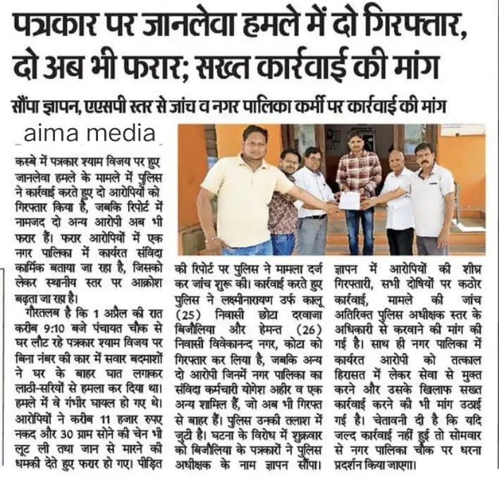 पत्रकार पर जानलेवा हमले में दो गिरफ्तार, दो अब भी फरार; सख्त कार्रवाई की मांग