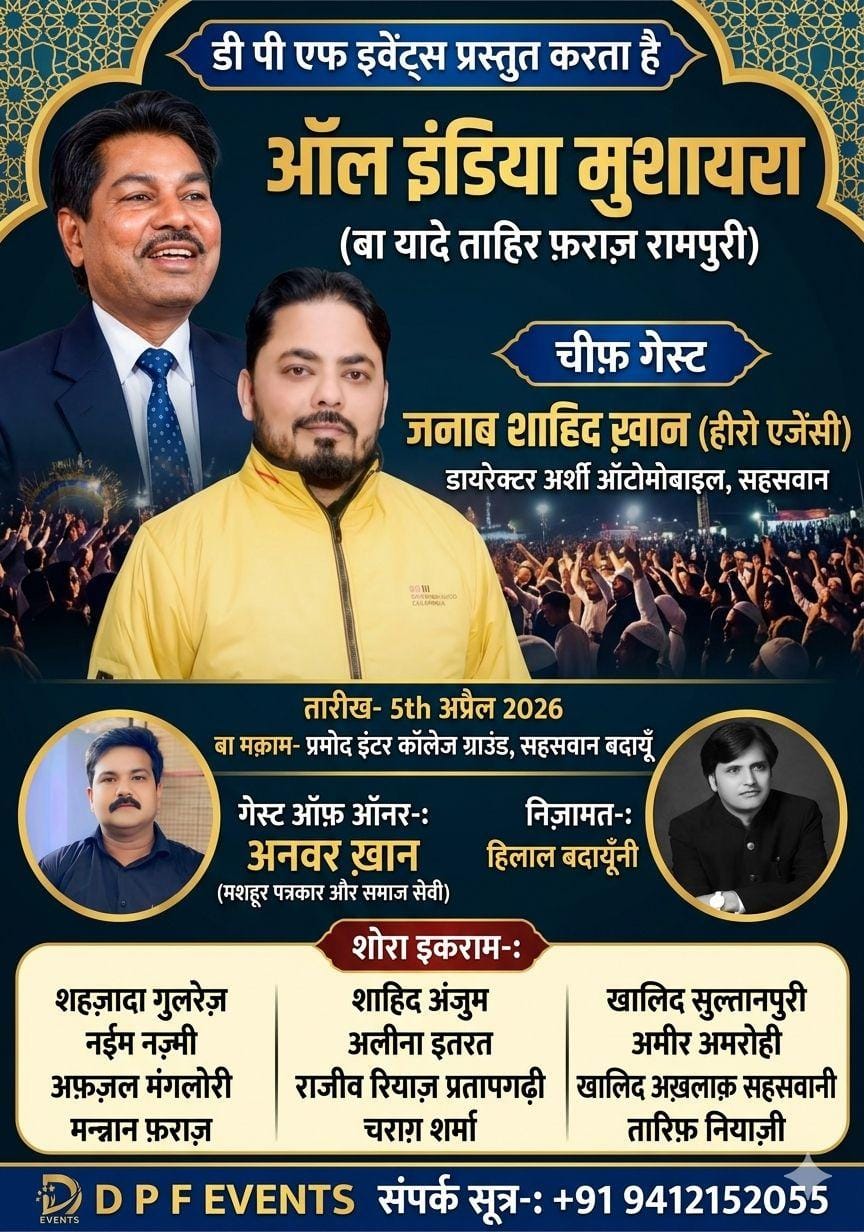 सहसवान (बदायूं)। शहर में अदबी माहौल को नई ऊंचाइयों पर ले जाने के उद्देश्य से डी पी एफ इवेंट्स के तत्वावधान में आगामी 5 अप्रैल 2026 शाम को एक भव्य ऑल इंडिया मुशायरा का आयोजन किया जा रहा है। खास बात यह है कि यह मुशायरा मरहूम शायर ताहिर फ़राज़ रामपुरी की याद में आयोजित किया जा रहा है।