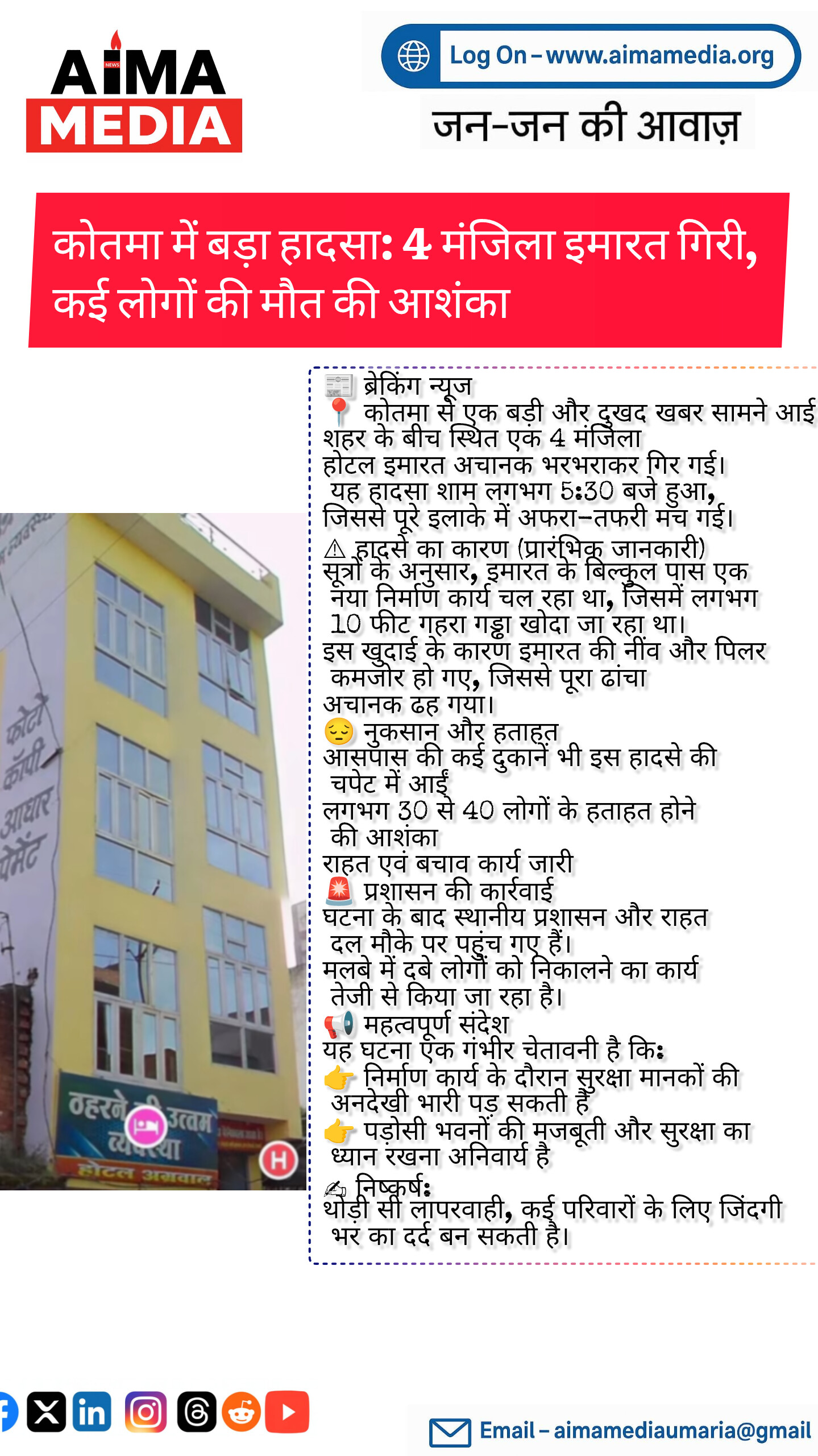 शहर के बीच स्थित एक 4 मंजिला होटल इमारत अचानक भरभराकर गिर गई। यह हादसा शाम लगभग 5:30 बजे हुआ, जिससे पूरे इलाके में अफरा-तफरी मच गई।