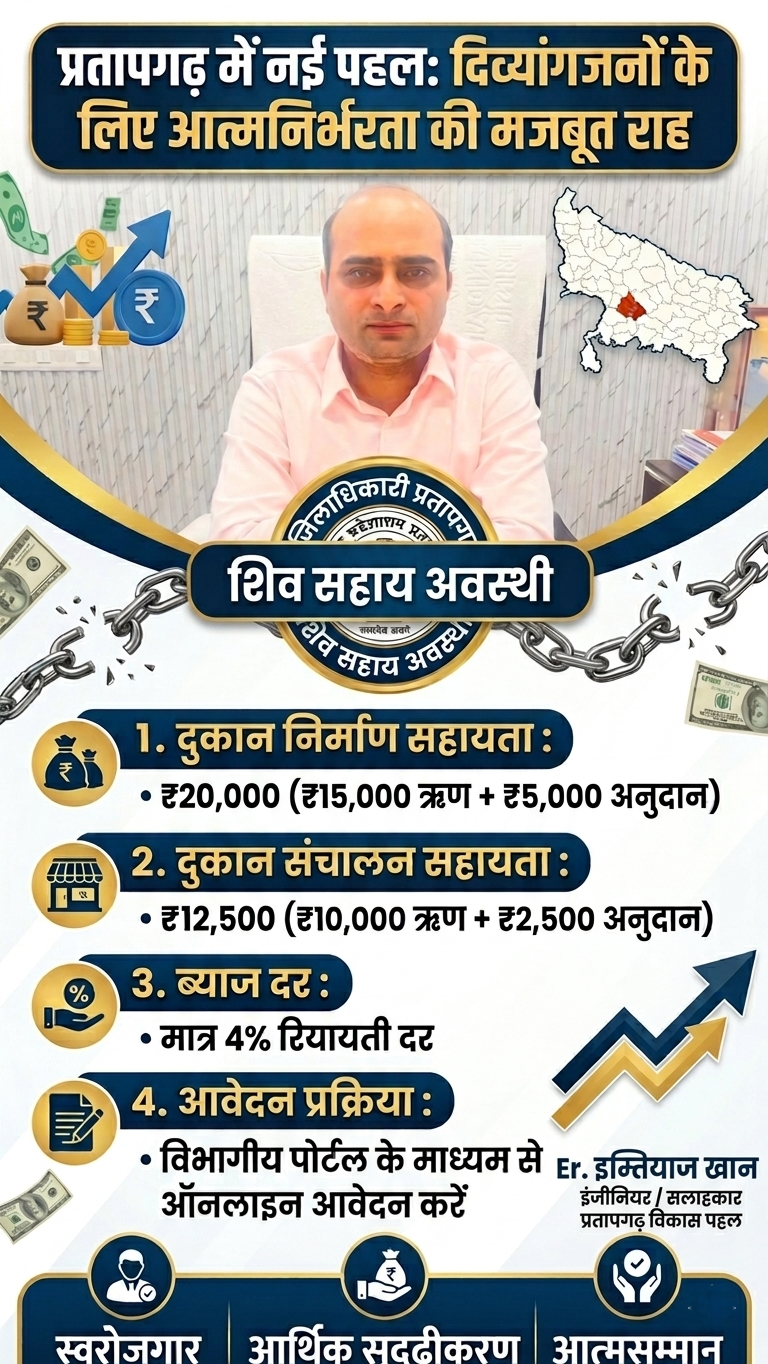 प्रतापगढ़ में दिव्यांगजन सशक्तीकरण को एक नई दिशा देते हुए जिलाधिकारी शिव सहाय अवस्थी की पहल पर “दिव्यांगजन दुकान निर्माण एवं संचालन योजना” को तेजी से लागू किया जा रहा है। यह योजना दिव्यांगजनों को आर्थिक रूप से मजबूत बनाने और उन्हें आत्मनिर्भर बनाने की दिशा में एक बड़ा कदम है।