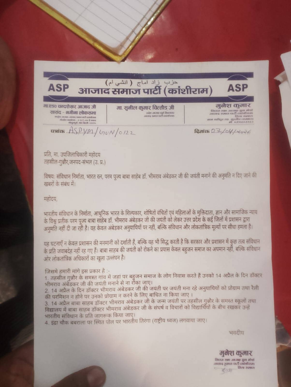 संभल,आज दिनांक 07/04/2026 को मुनेश कुमार तहसील अध्यक्ष युवा मोर्चा आजाद समाज पार्टी (कां) गुन्नौर के नेतत्व में तहसील गुन्नौर के सभी गांव जहाँ बहुजन समाज के लोग रहते हैं उन गांव में डॉ भीम राव अम्बेडकर जी की जयंती 14 अप्रैल को बिना परमिसन के मनाने के लिए उपजिलाधिकारी महोदय गुन्नौर, जनपद-संभल को एक चार सूत्रीय मांगों को लेकर ज्ञापन सौंपा गया।