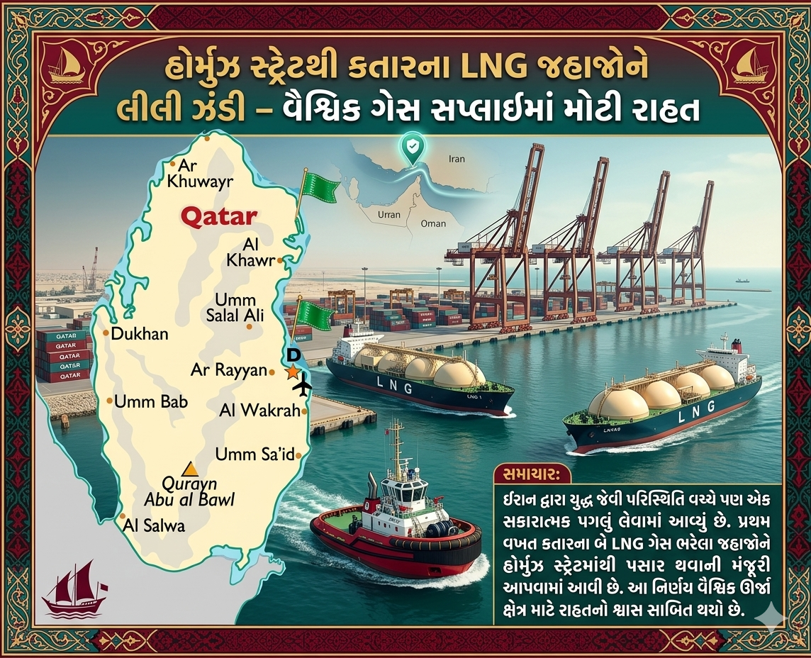 ઈરાન દ્વારા યુદ્ધ જેવી પરિસ્થિતિ વચ્ચે પણ એક સકારાત્મક પગલું લેવામાં આવ્યું છે. પ્રથમ વખત કતારના બે LNG ગેસ ભરેલા જહાજોને હોર્મુઝ સ્ટ્રેટમાંથી પસાર થવાની મંજૂરી આપવામાં આવી છે. આ નિર્ણય વૈશ્વિક ઊર્જા ક્ષેત્ર માટે રાહતનો શ્વાસ સાબિત થયો છે.