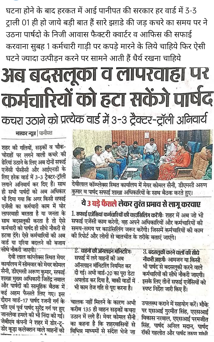 Panipat Mein badsaluki Karne wale karmchariyon ko parshad hata sakti hain. Aur Har ward mein teen tractor Kuda uthane ke liye anivarya kar diye gaye